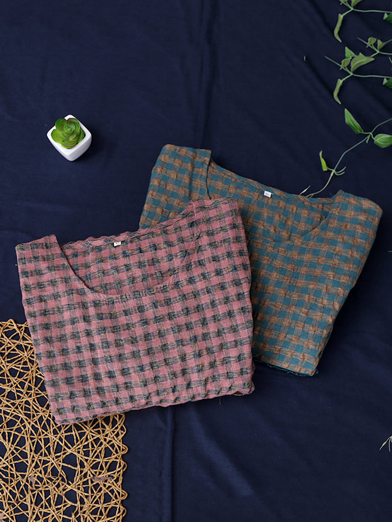 Plus Size Summer Plaid Round Neck Cotton Linen Midi Dress XX1060