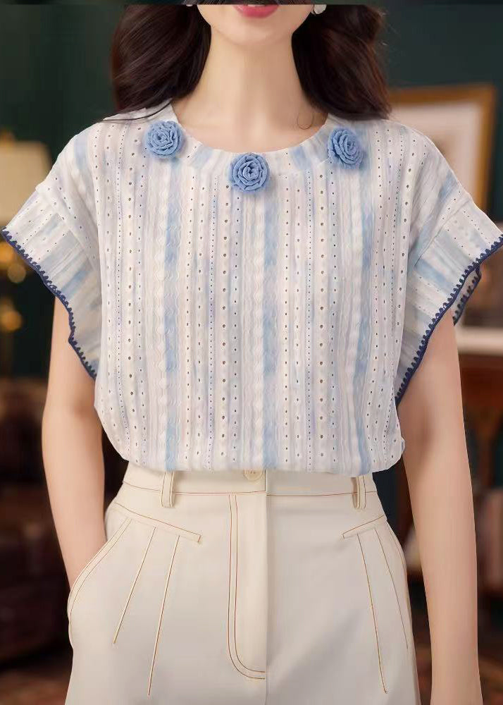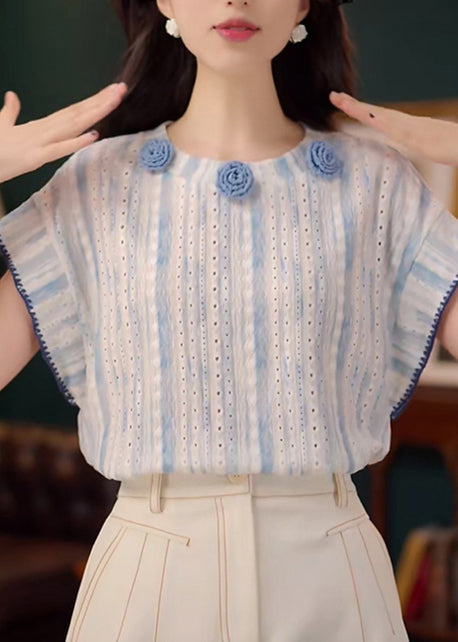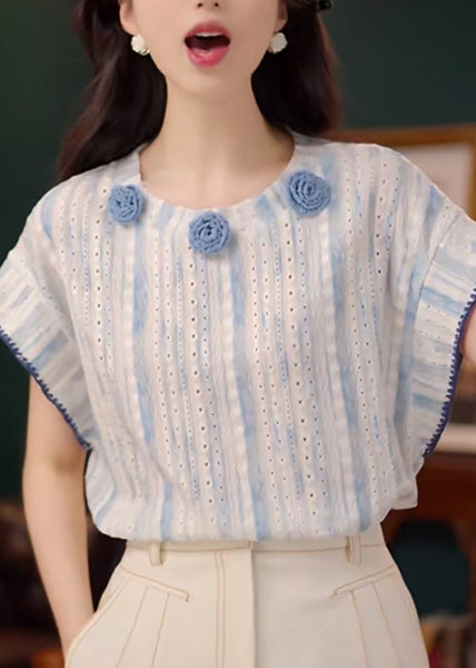 Tanks Summer Out Blue Cotton Organic Hollow Floral Decorated FashionChic