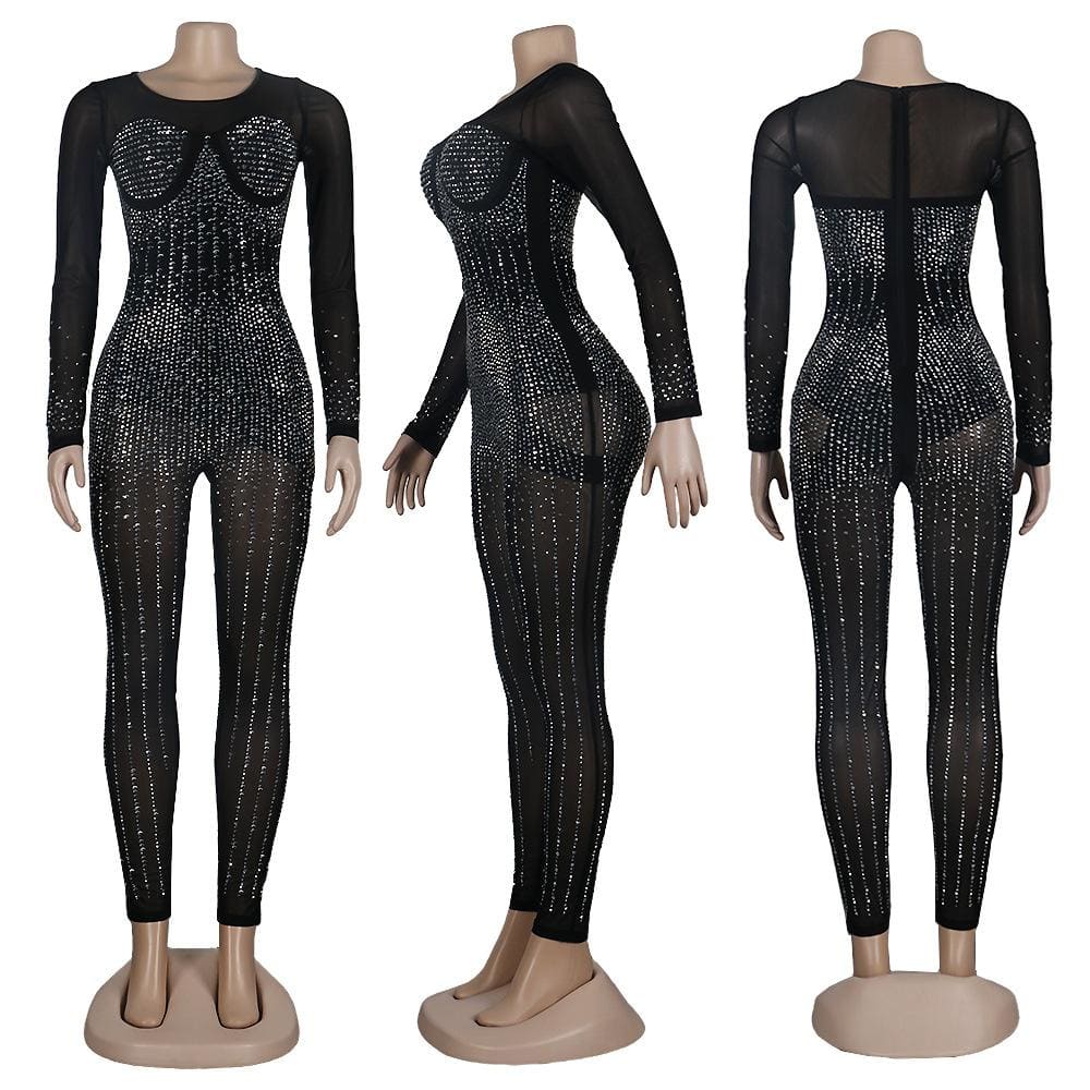 Life is too short to live without the Black Patchwork Hot Drilling See-through Skinny Jumpsuits F3732. Be happy. Be Content. Be Satisfied.