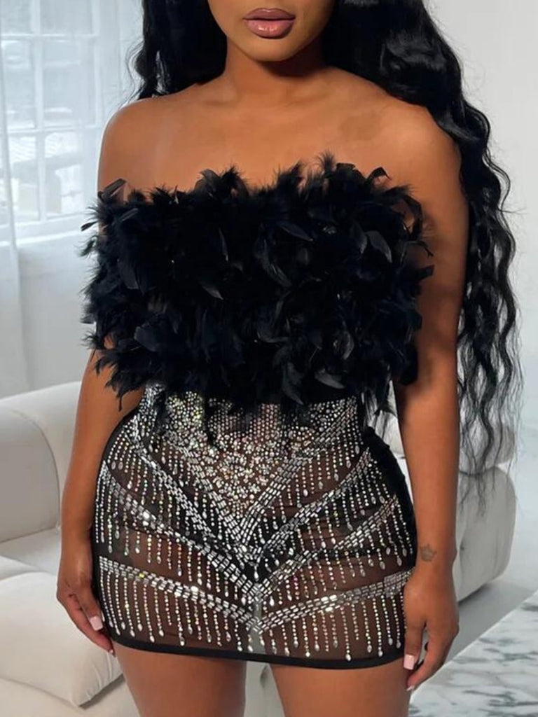 Product Title :Off The Shoulder Feather Decor Rhinestone See Through Dress