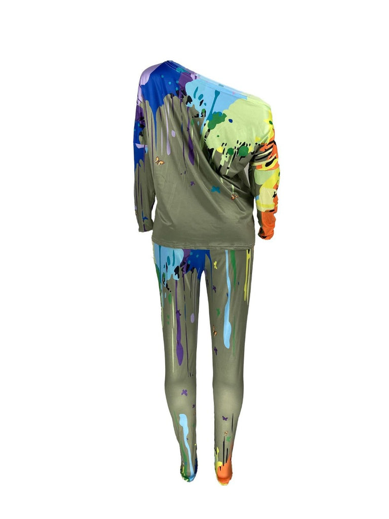 Plus Size Inclined Neck Splash Ink Pants Set AT908
