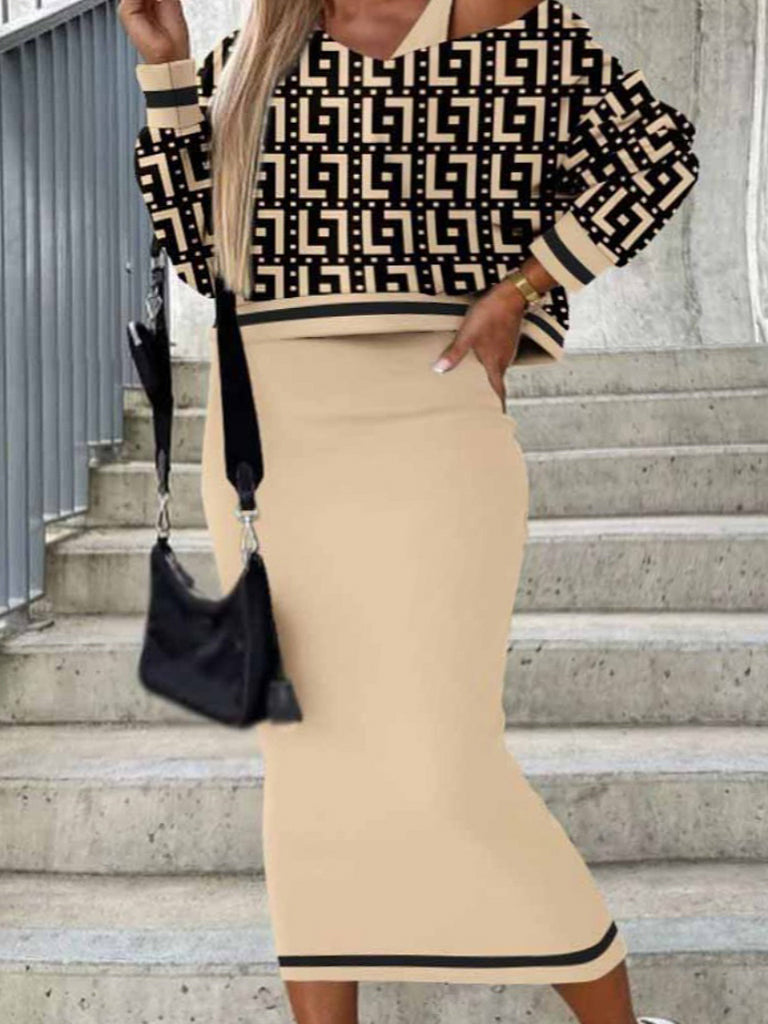 Plus Size V Neck Geometric Print Striped Skirt Set AC2065