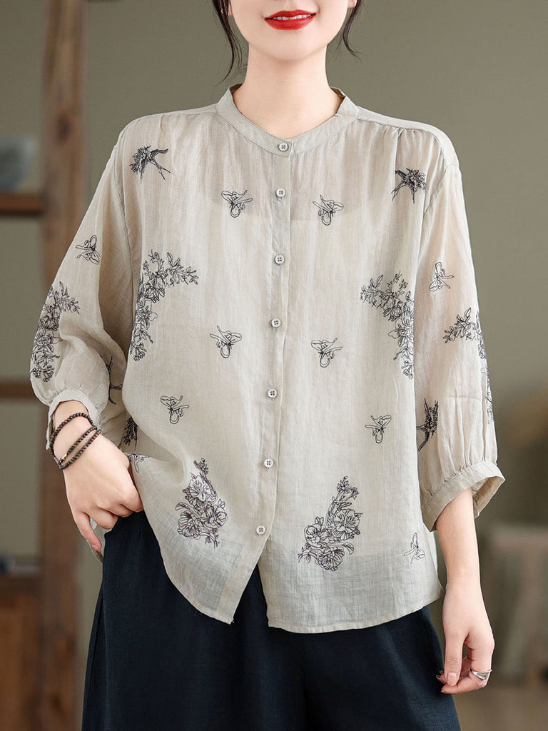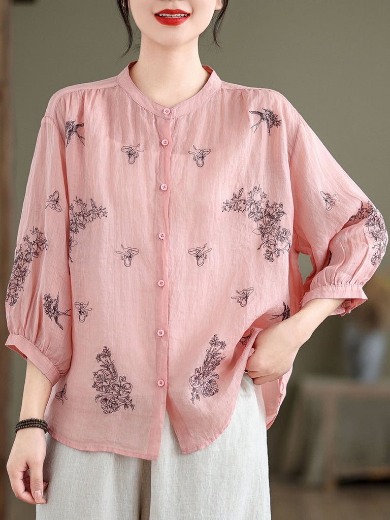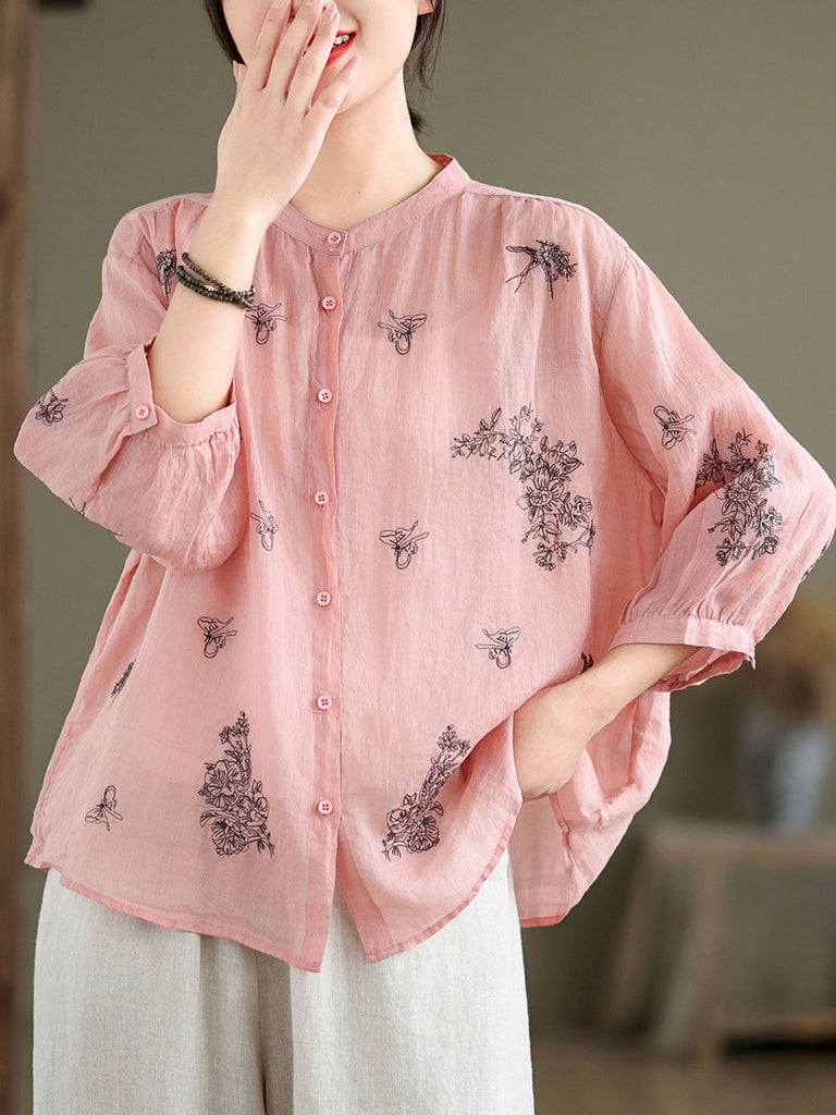 Women Artsy Flower Summer Ramie Blouse KL1018