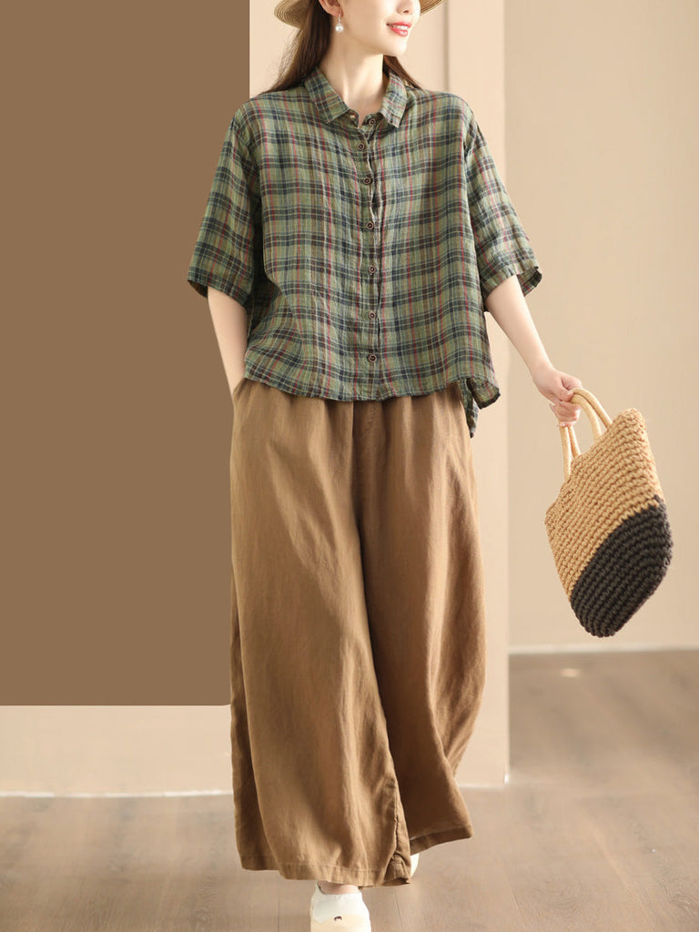 Indulge in the luxurious craftsmanship of this 100% linen button-up shirt. Adorned with a captivating plaid pattern, it features a fashionable turn-down collar and short, regular sleeves that exude artistic charm. Elevate your wardrobe with this elegant and sophisticated piece.