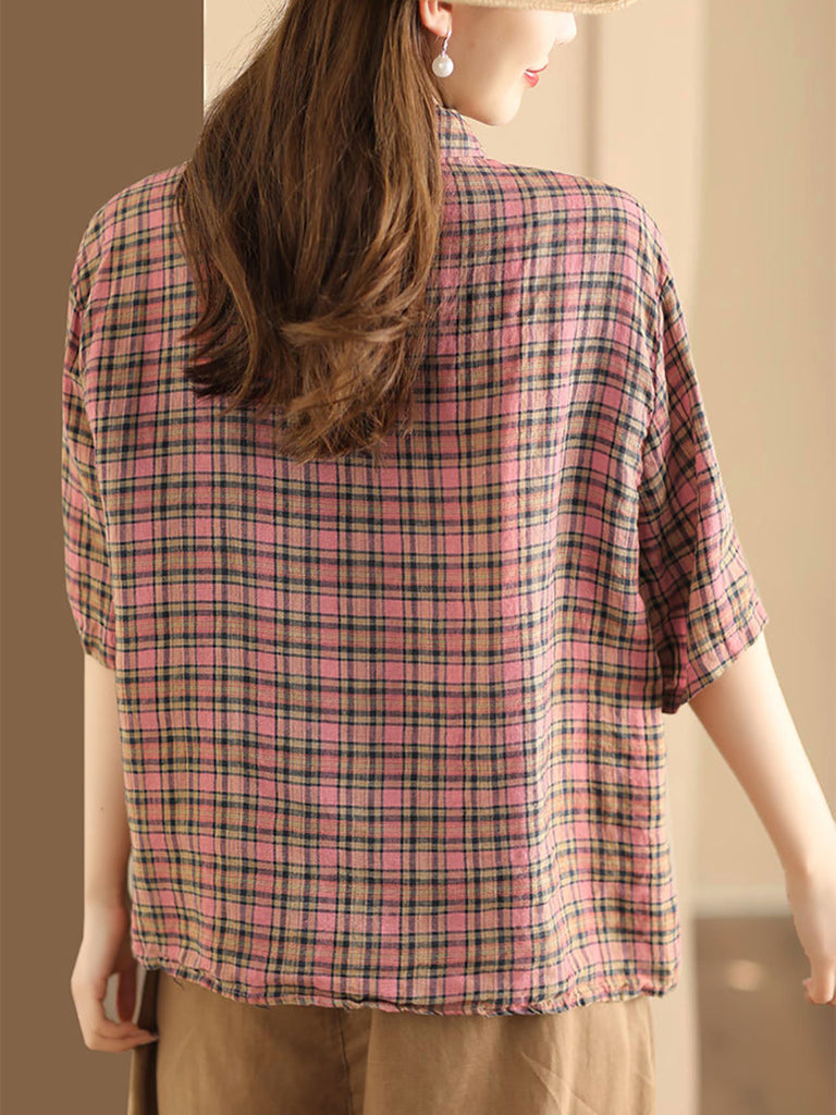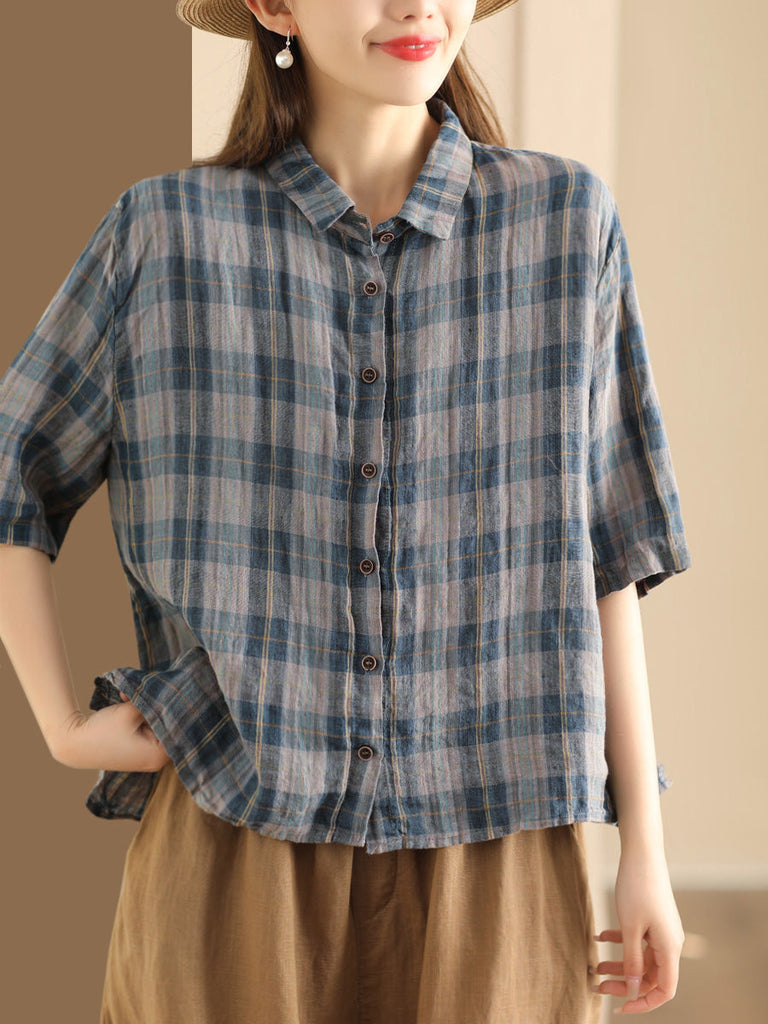 Women Artsy Plaid Summer Button-up Linen Shirt KL1012