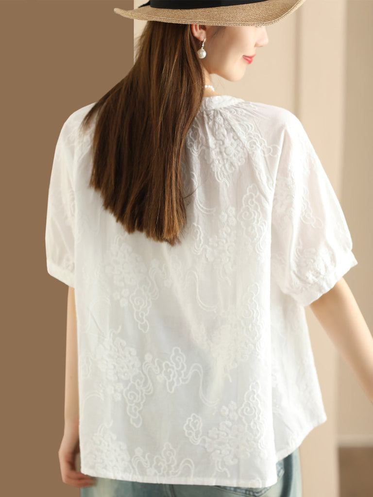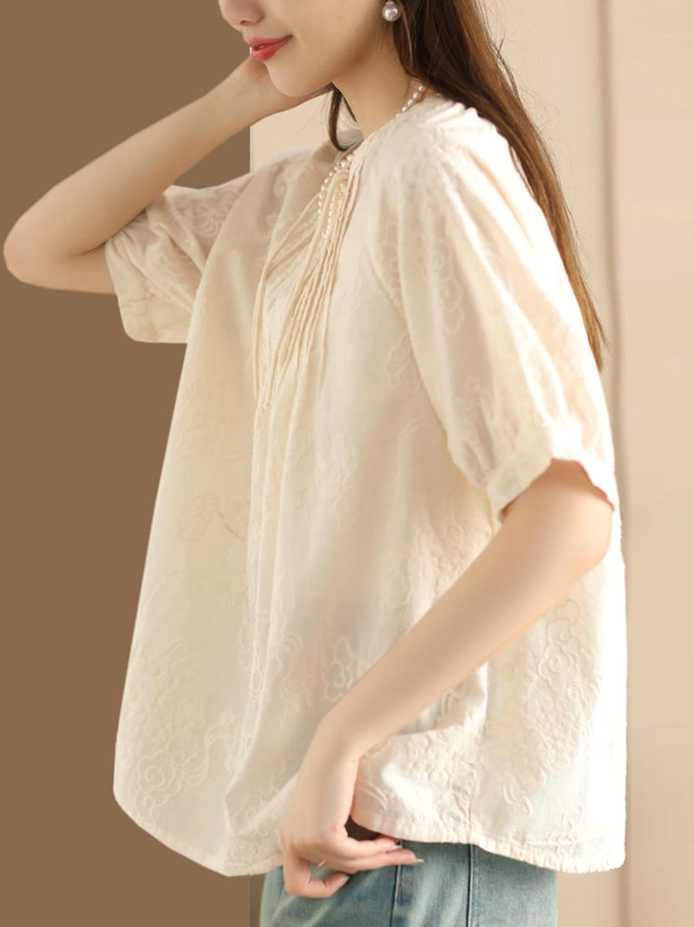 Women Artsy Solid Jacquard Shirred Cotton Loose Shirt XX1018