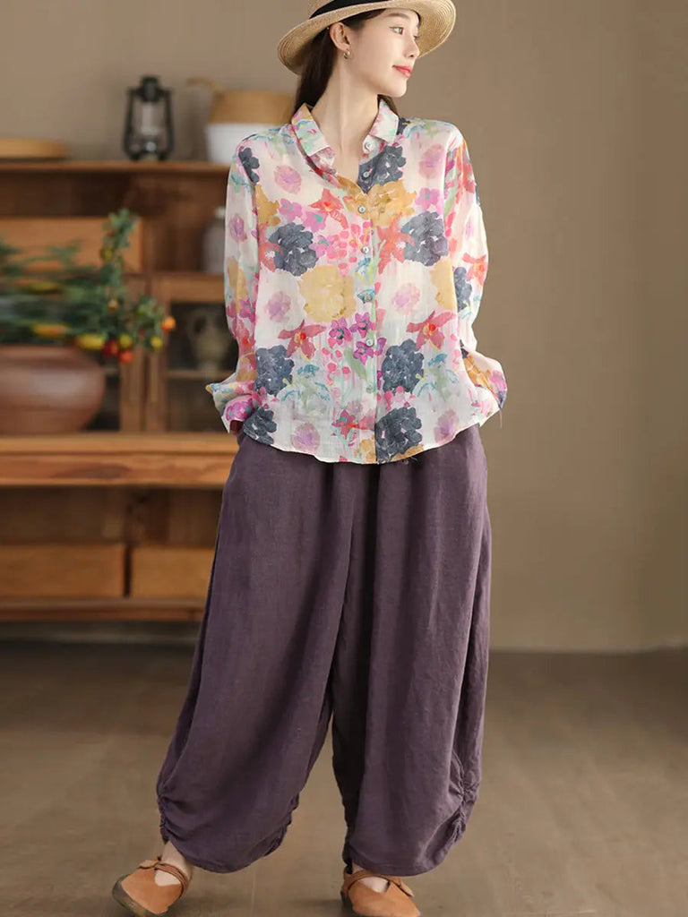 Crafted from 100% ramie, this Women Artsy Spring Flower Ramie Shirt features a classic turn-down collar and full, regular sleeves. The vintage-inspired design is perfect for the spring and summer seasons.