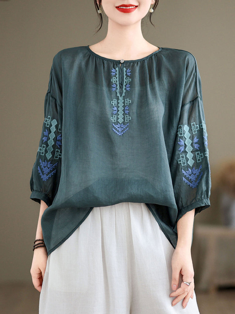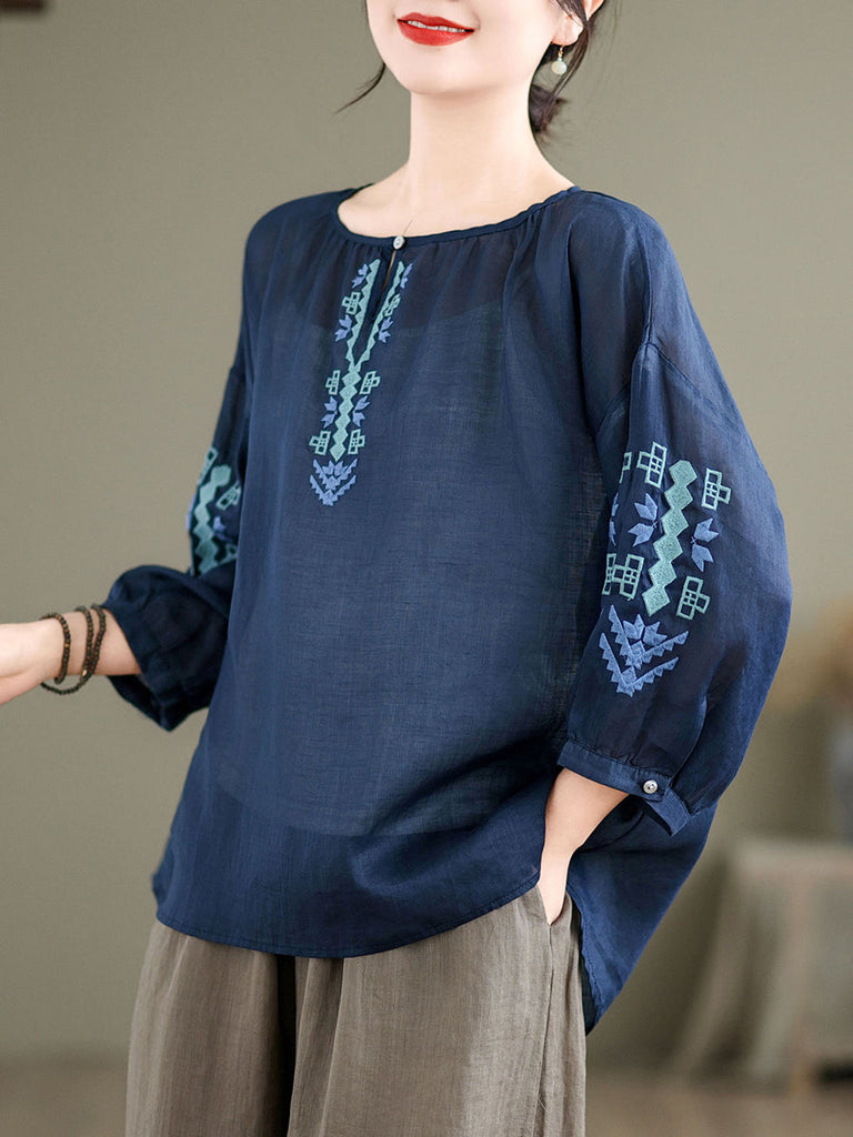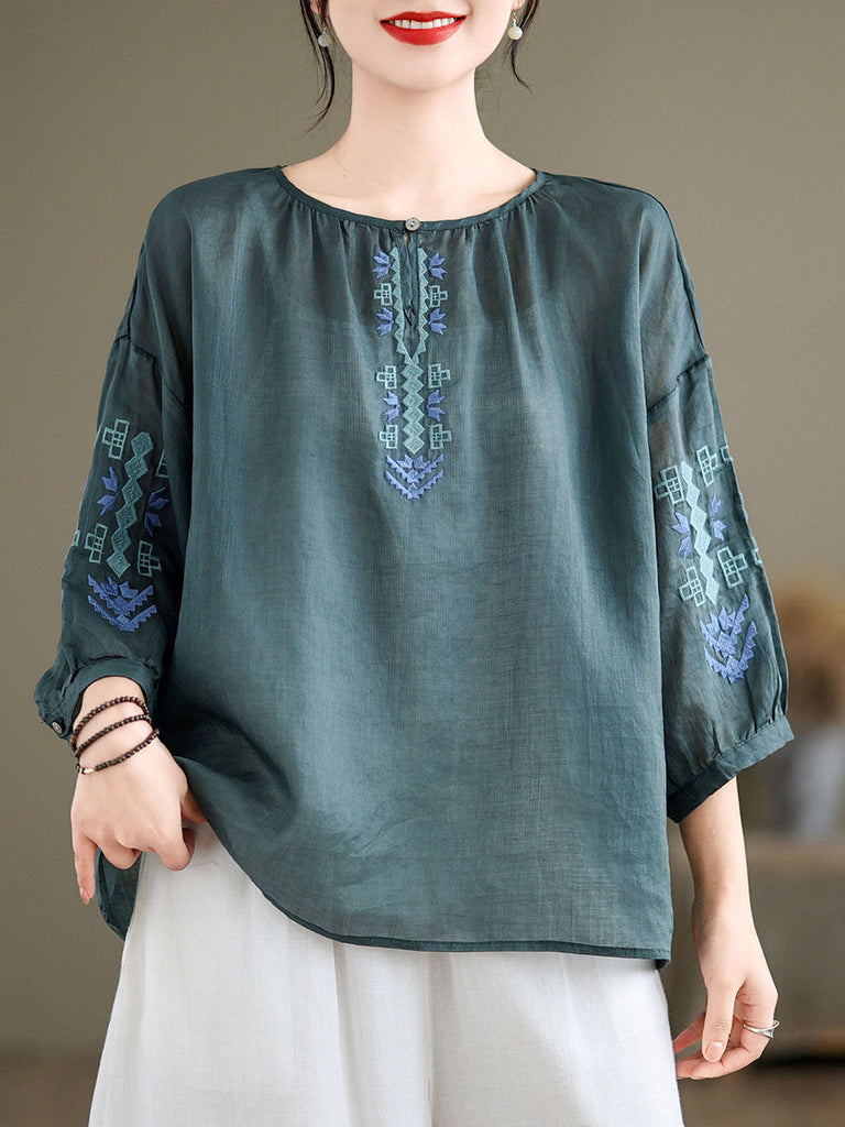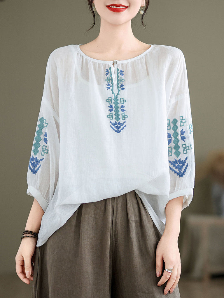 Women Artsy Summer Embroidery O-Neck Ramie Blouse KL1019