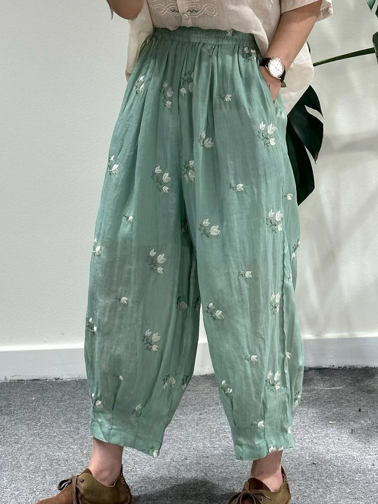 Women Artsy Summer Flower Embroidery Ramie Harem Pants KL1018