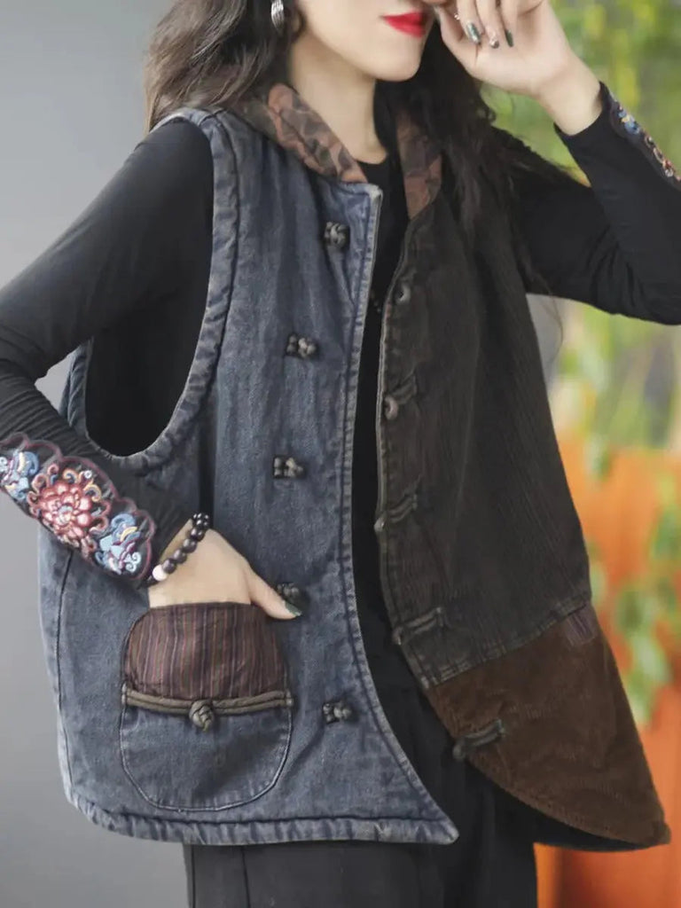 This hooded vest coat is constructed from soft fabric and features a stylish spliced pattern, making it a fashionable and comfortable choice for the autumn and winter months.