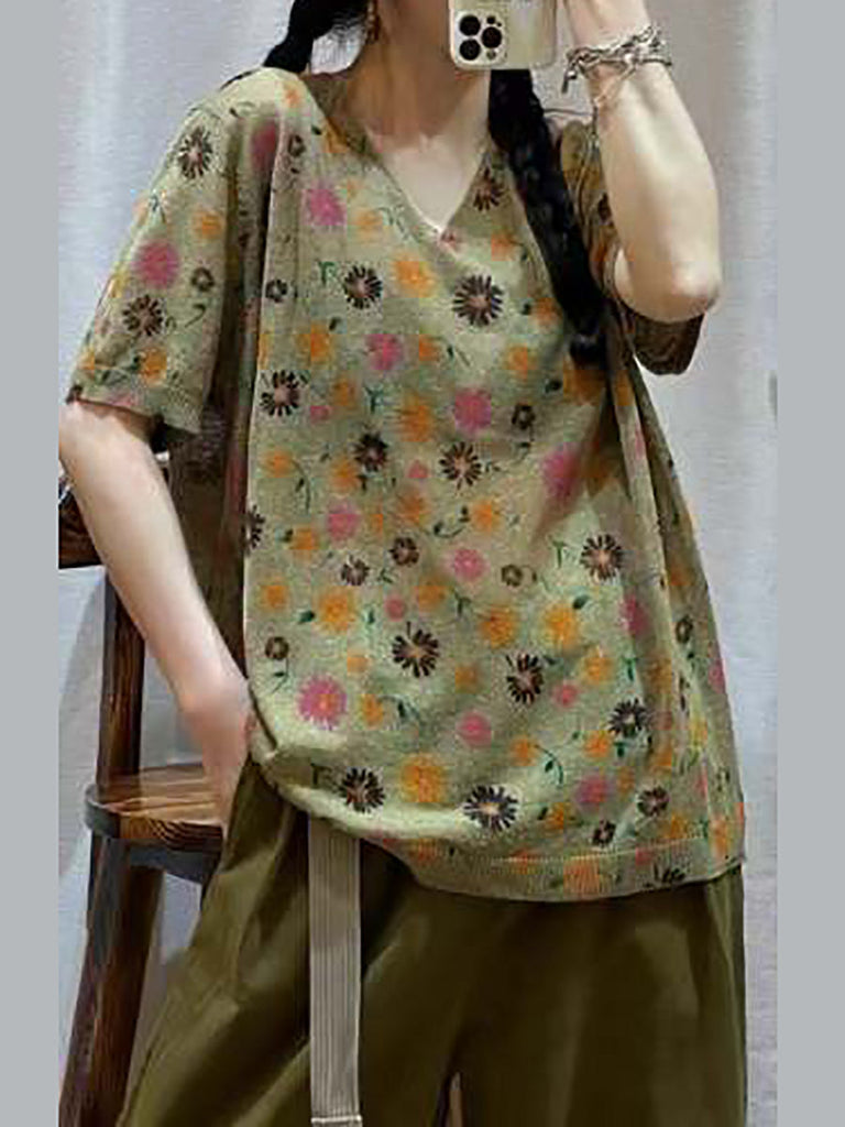 Women Casual Flower Summer V-Neck Loose Pullover Shirt QW1028
