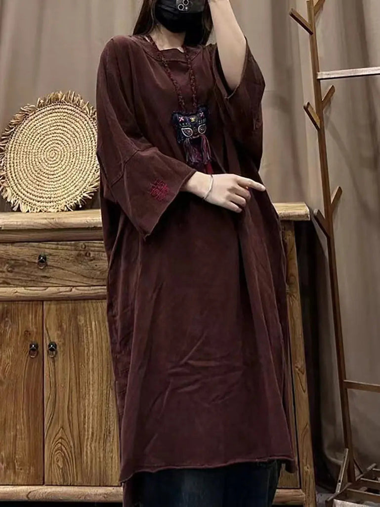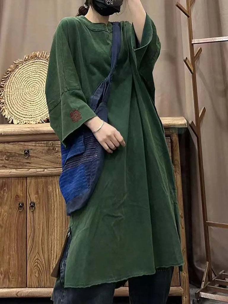 This dress is made of cotton with a solid pattern and O-neck collar. The 3/4 length raglan sleeves and calf length make it perfect for warmer weather, and the embroidered details add a special touch. Appropriate for both spring and summer seasons.