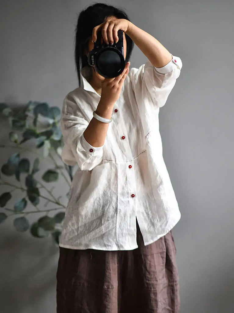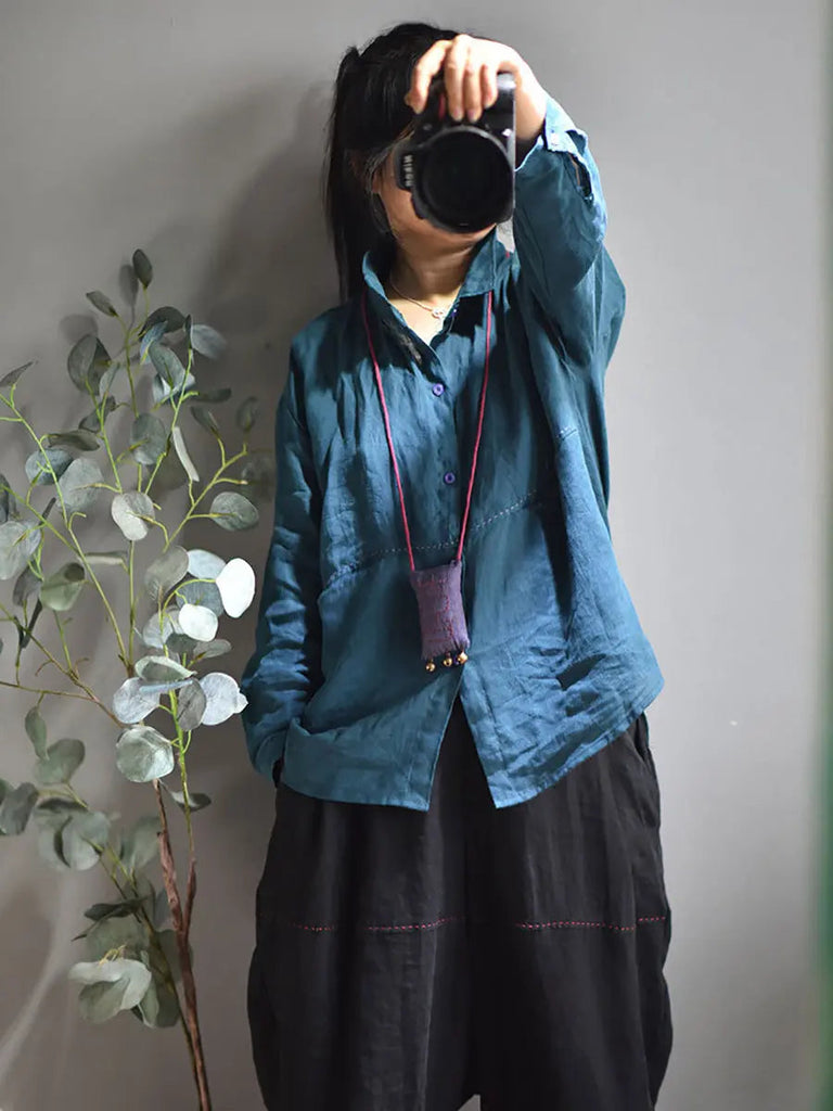 Women Solid Stitching 100%Linen Shirt
