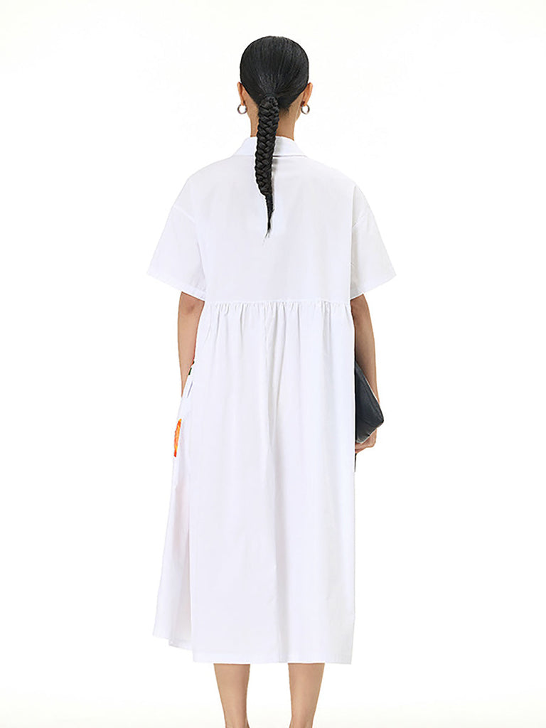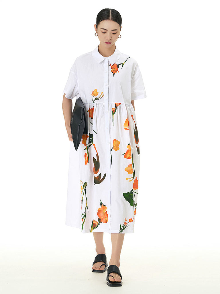 Indulge in luxury with this 100% cotton dress, featuring a turn-down collar and a beautiful spliced flower pattern. Its regular short sleeves and ankle-length design make it the ideal choice for the warmer months. Embrace sophistication and elegance with this must-have summer staple.