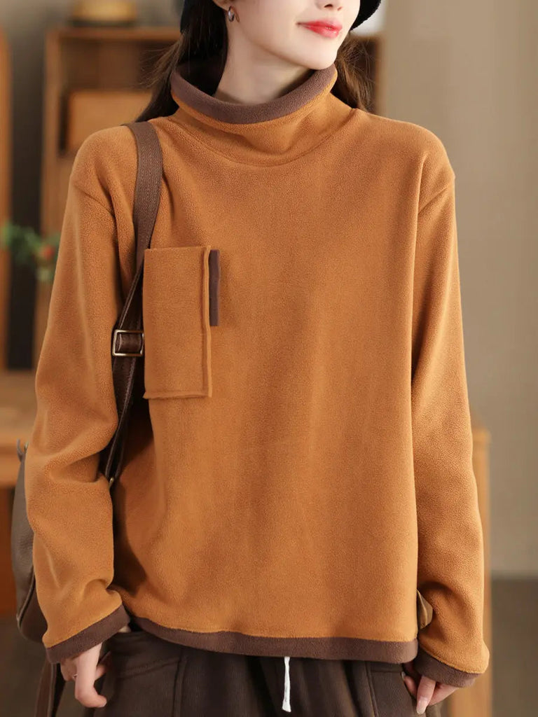 Women Spliced Turtleneck Fleece Sweatshirt