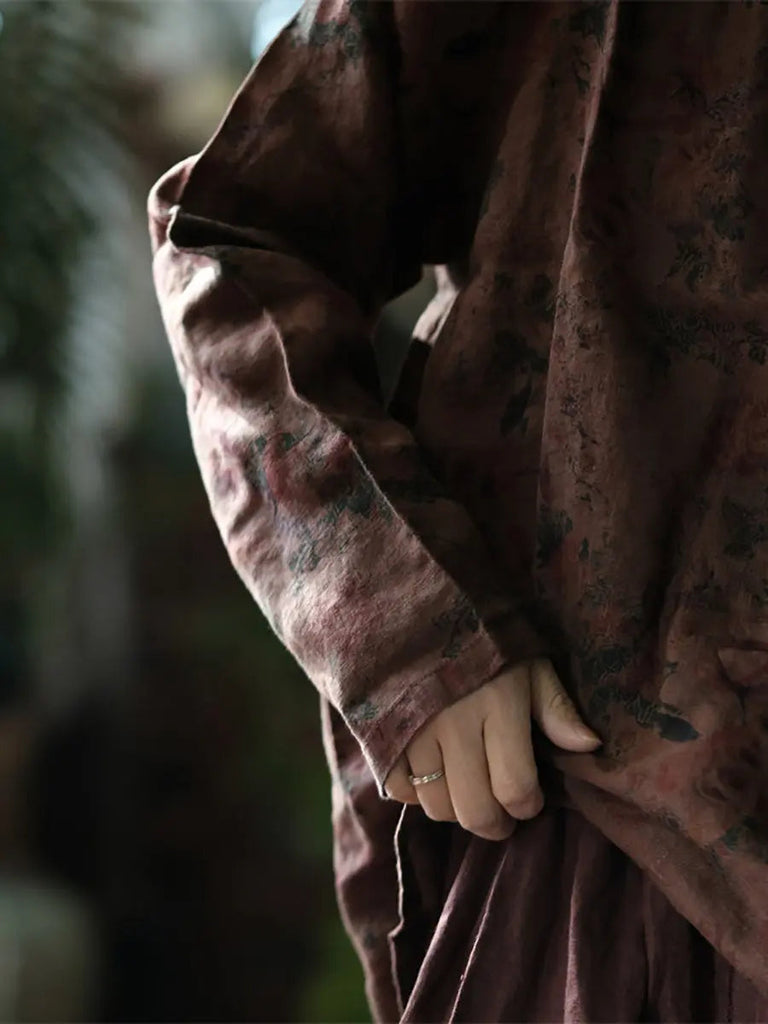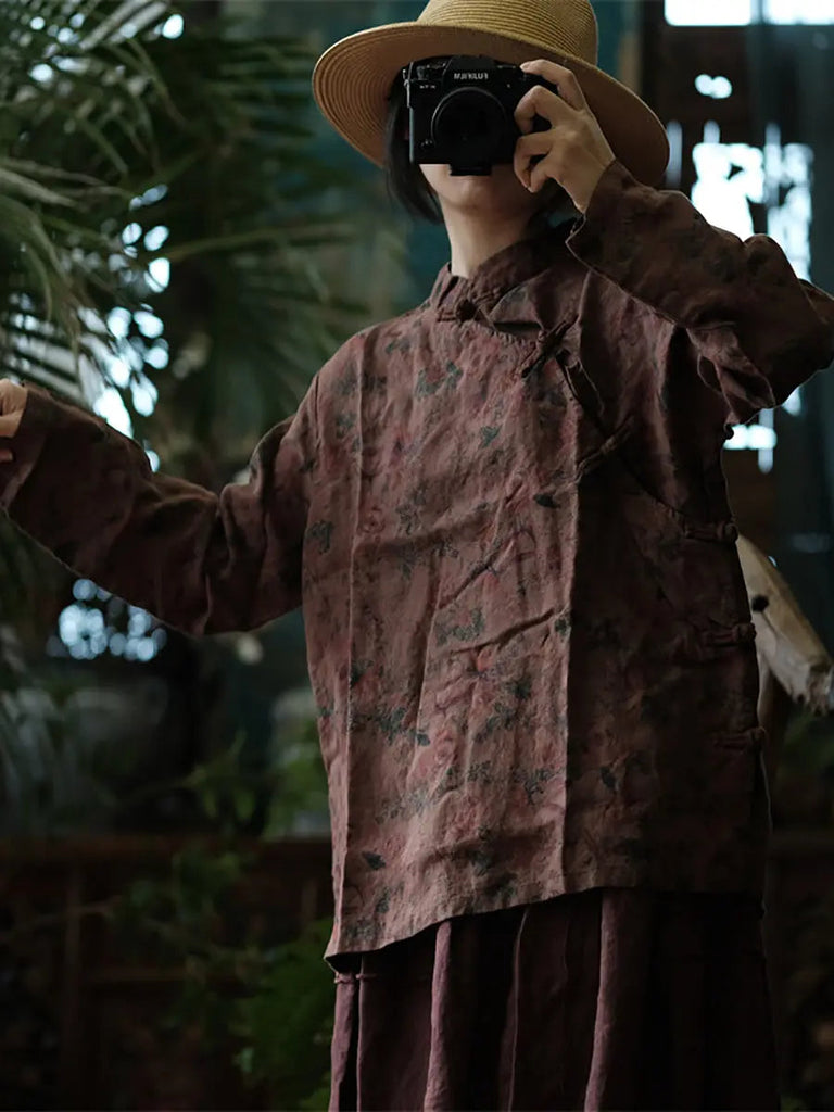 This Women Ethnic Floral Print Linen Shirt is crafted from 100% linen and features a beautiful floral pattern. It has a stand collar and full raglan sleeves, giving it a stylish vintage look. Perfect for the autumn and spring seasons.