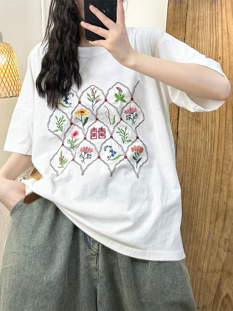 Women Ethnic Flower Embroidery Cotton Summer Shirt WE1047