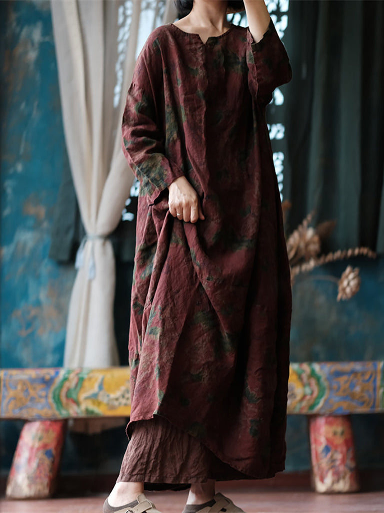 Indulge in the luxury of the Women Ethnic Flower Worn Loose Long Sleeve Linen Dress, boasting a graceful V-neck collar and Reglan sleeves. Cascading down to ankle-length, both the sleeves and the dress are crafted from soft, airy linen and adorned with an exquisite floral print, making it the ideal choice for the balmy summer months.
