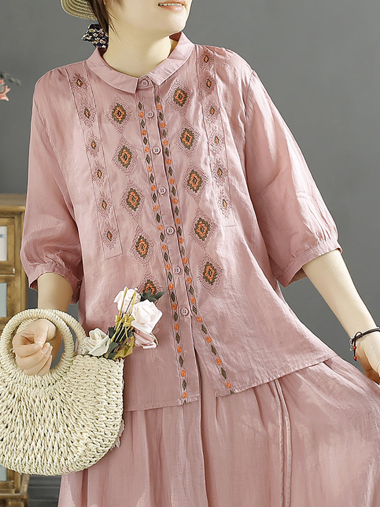 Women Ethnic Rhomboids Embroidery Ramie Button Up Blouse KL1031