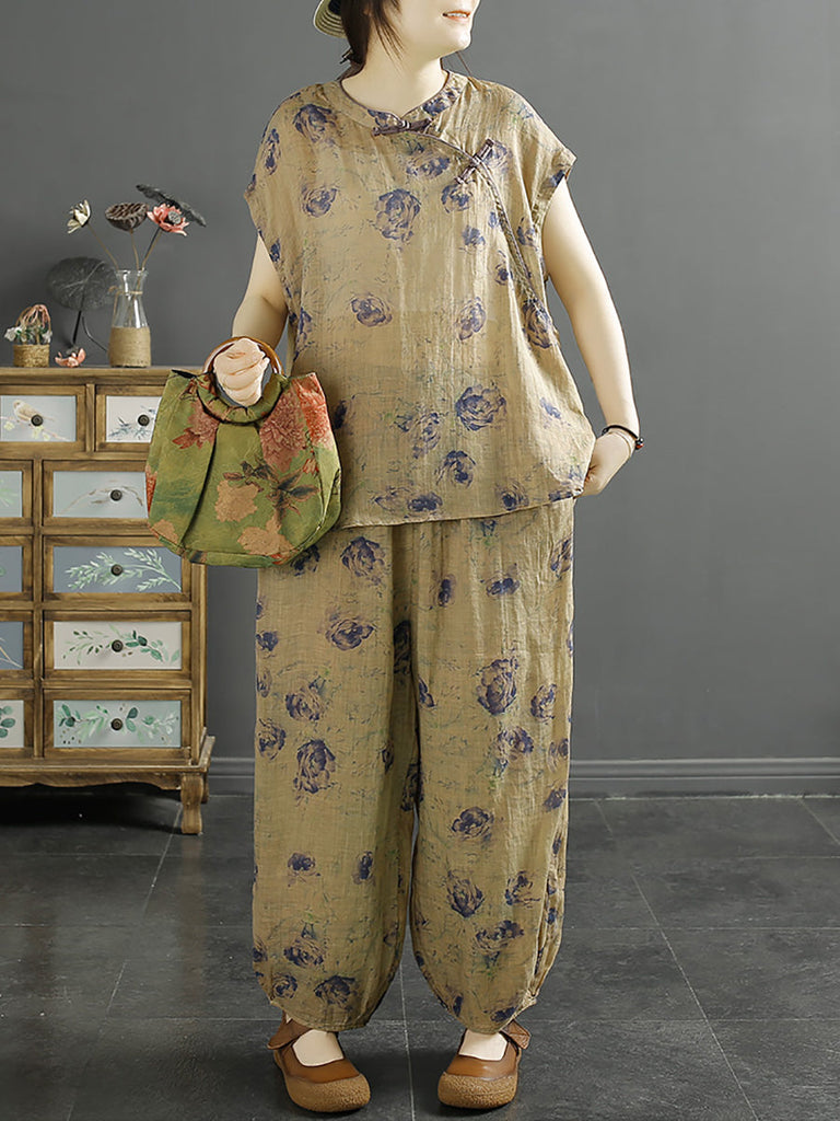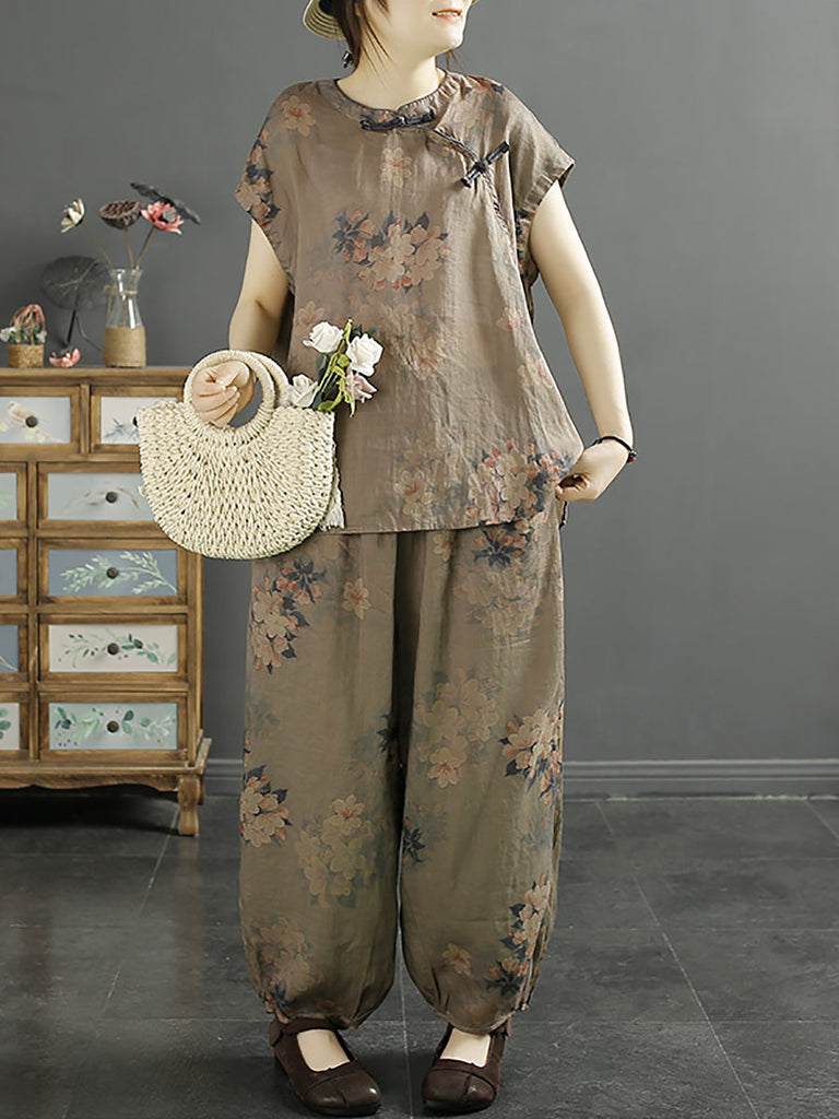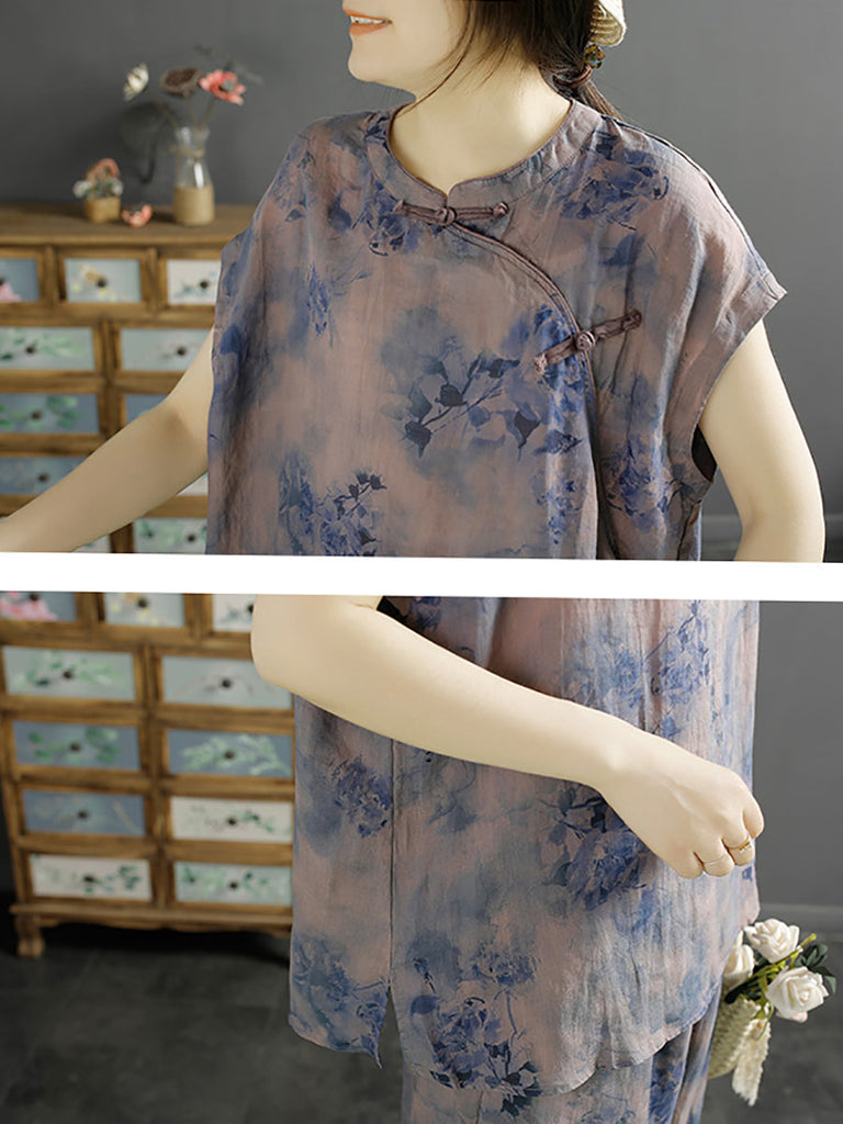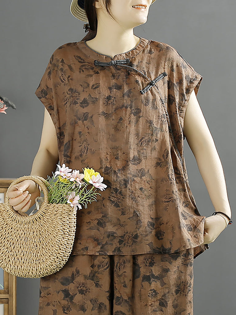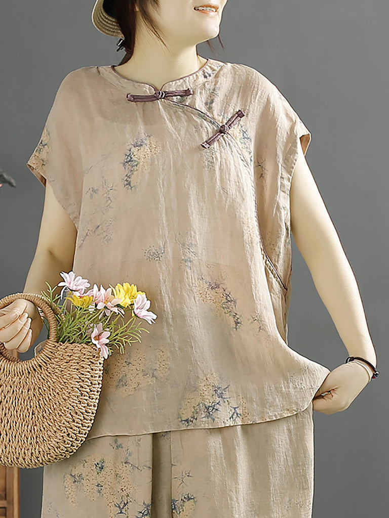 Women Ethnic Summer Floral Buckle 100%Ramie Shirt KL1007