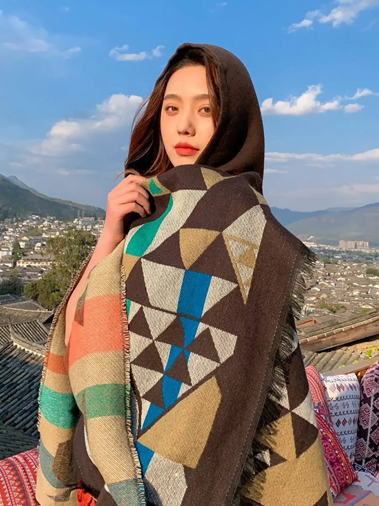Stay cozy and stylish with our Women Spliced Hooded Shawl! This trendy accessory features a unique design that combines a shawl and a hood, perfect for any weather. Stay warm, stay chic, stay you.