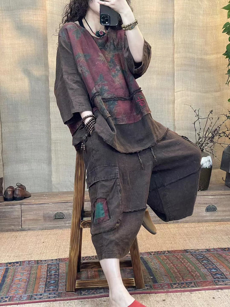 Women Retro Flower Spliced Summer Linen Shirt KL1028