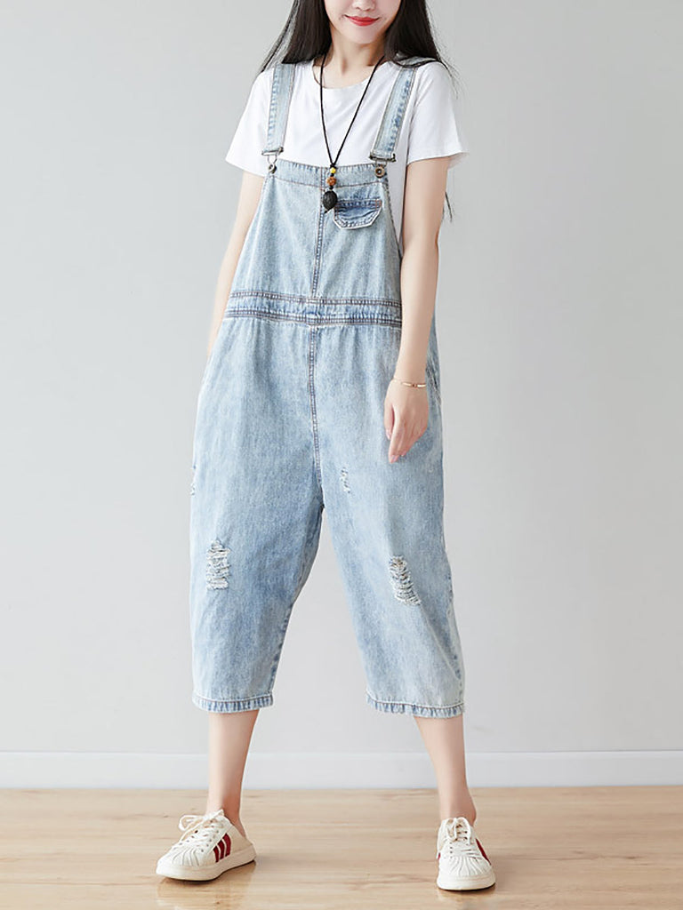 This denim jumpsuit is crafted from cotton and features a solid pattern. It has pockets and frayed detailing, as well as a button closure. The thickness is standard and the waist line is high, with pants that are calf-length. Perfect for spring and summer seasons.