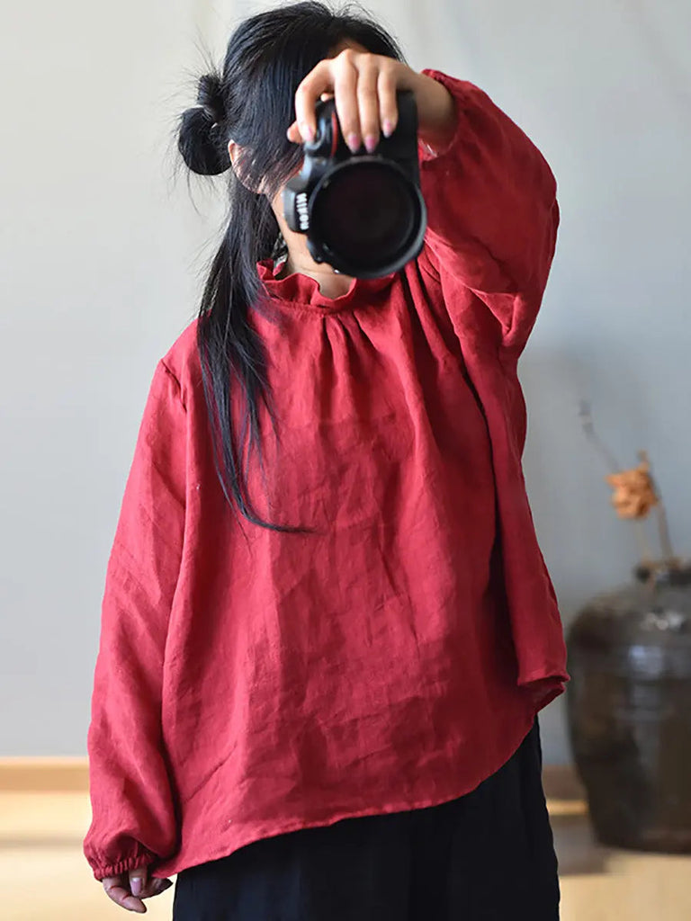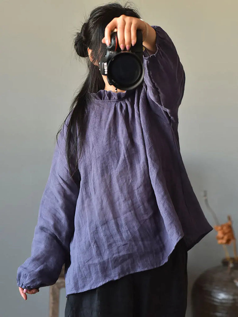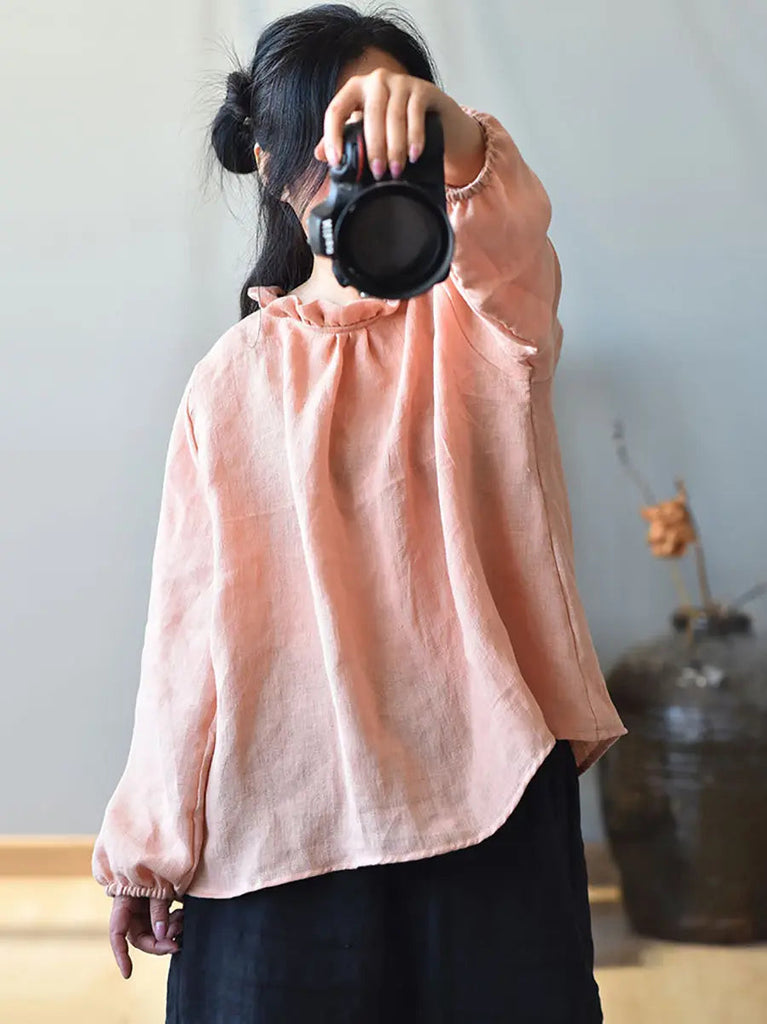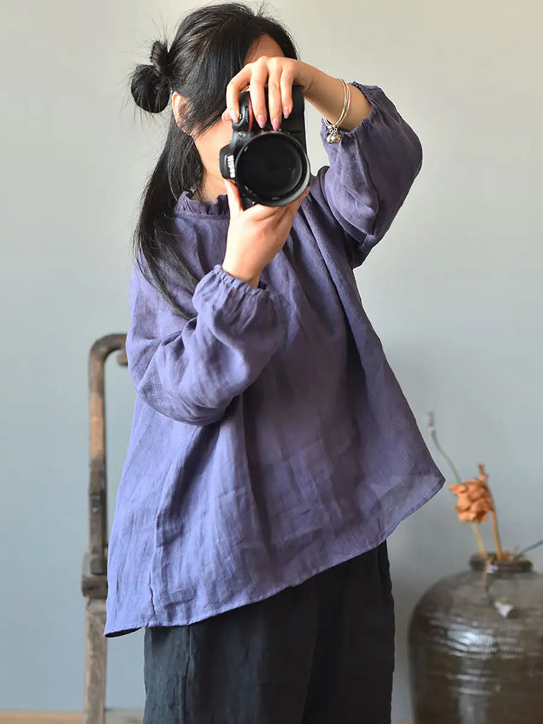 Women Ruffle Collar Solid 100%Linen Shirt