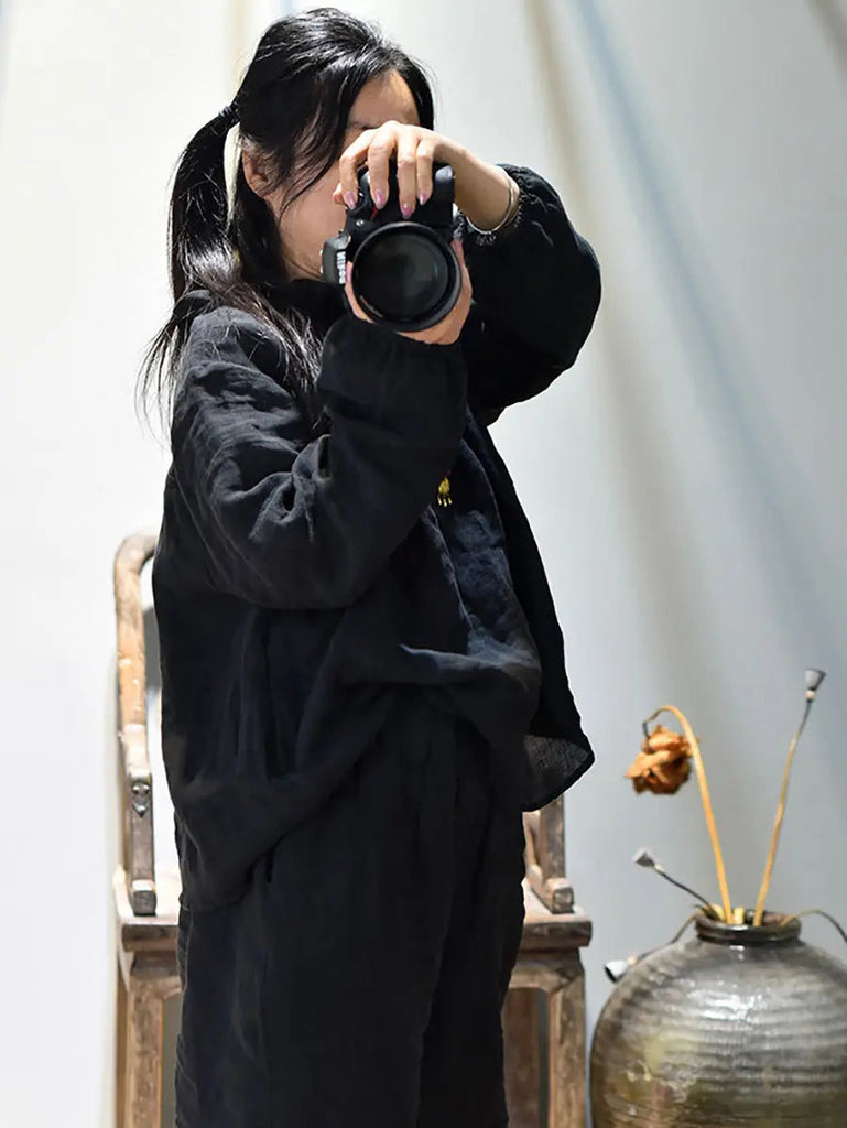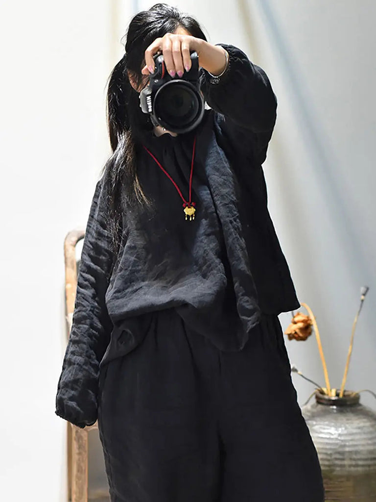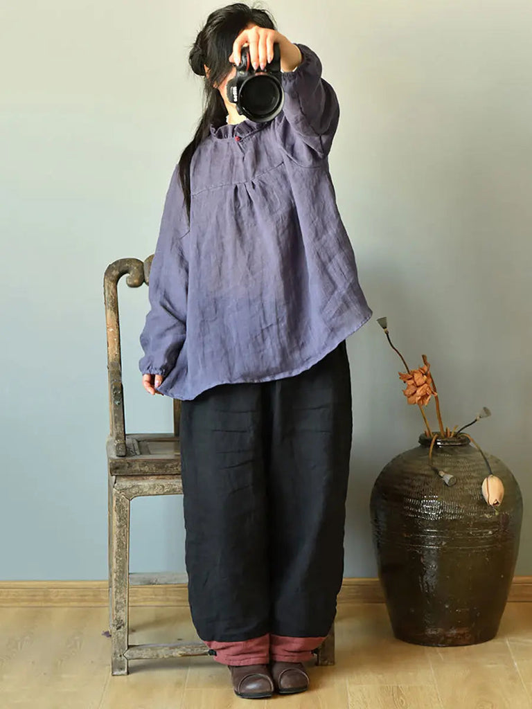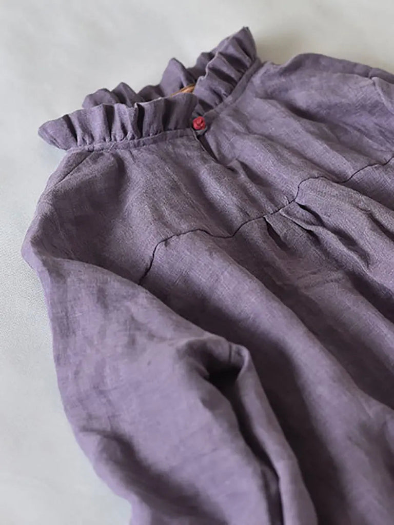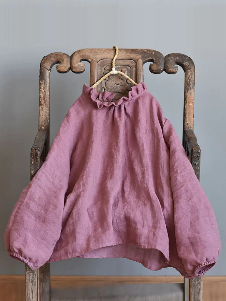 Women Ruffle Collar Solid 100%Linen Shirt