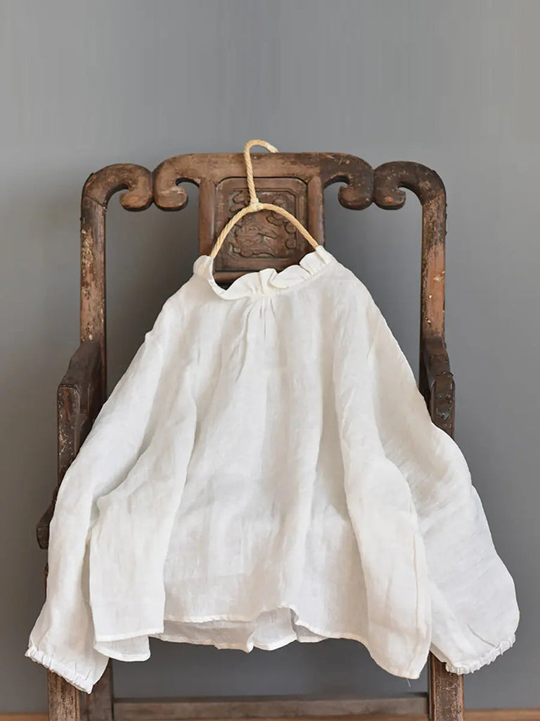 Made from 100% linen, this shirt features a solid pattern and a ruffle collar. The sleeves are full length and have a raglan and vintage style, making it perfect for autumn and spring seasons.