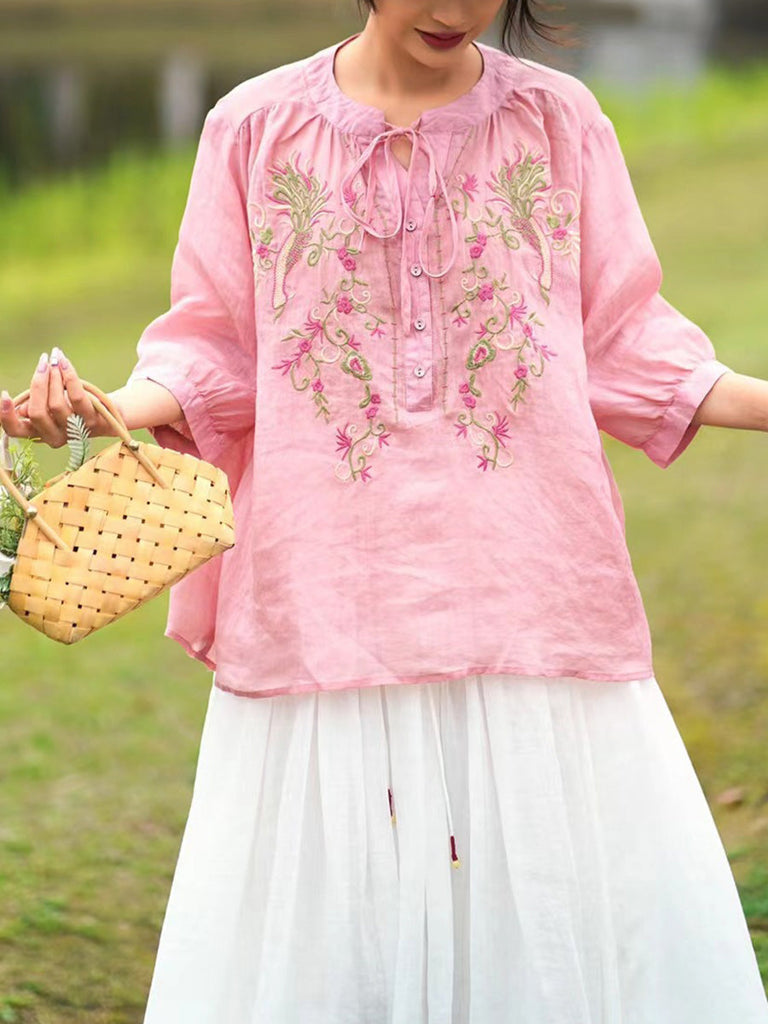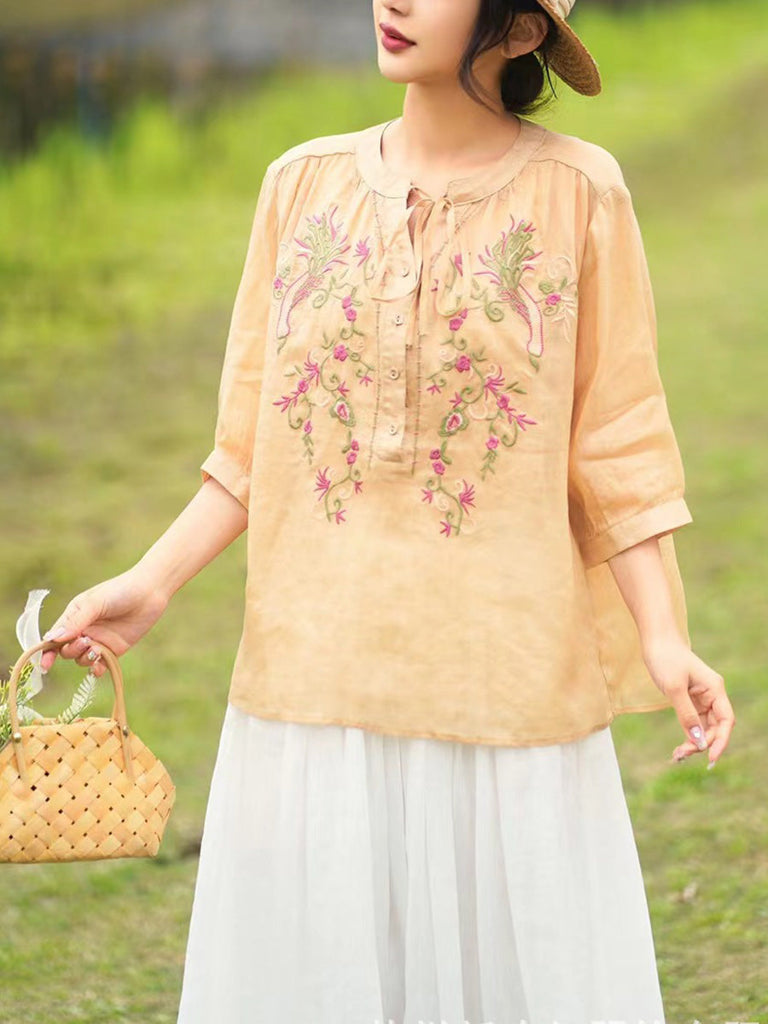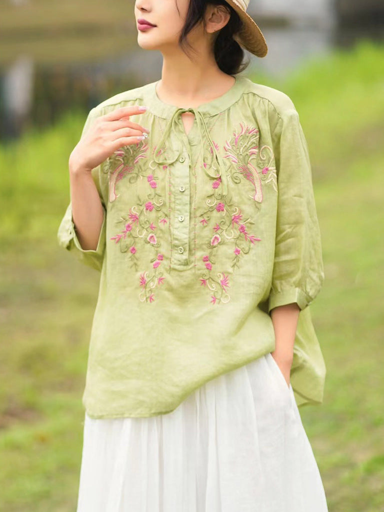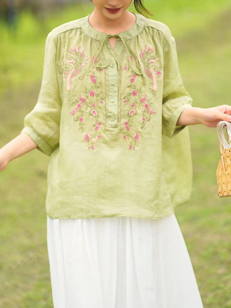 Women Summer Artsy Floral Embroidery Ramie Shirt PA1002