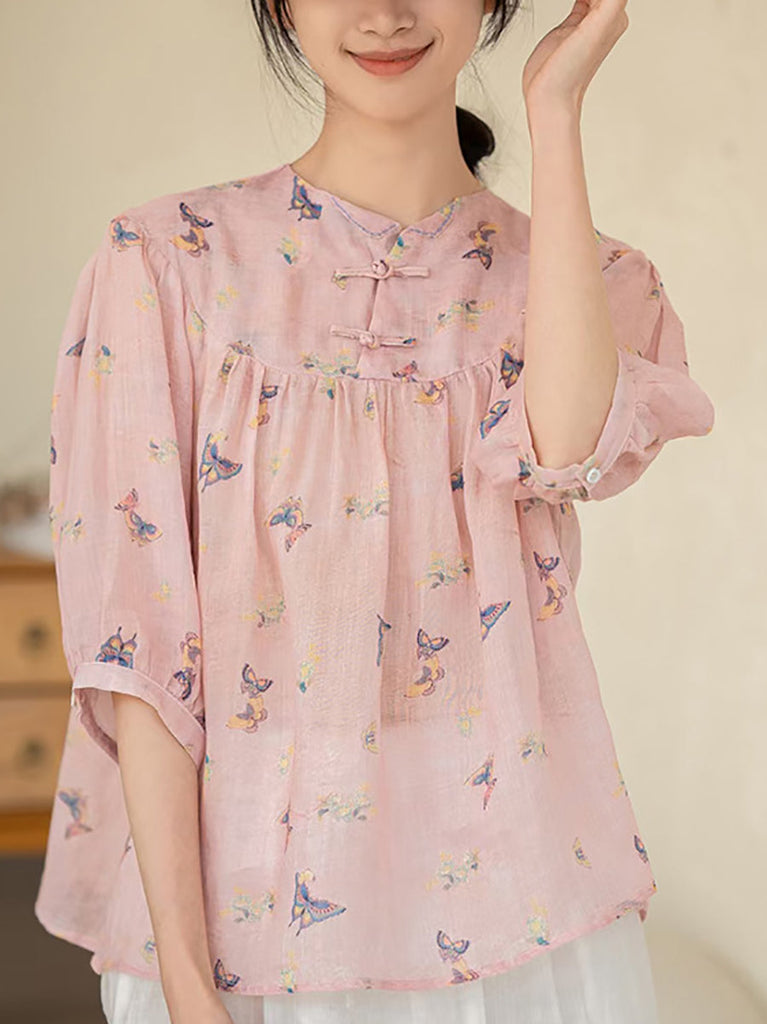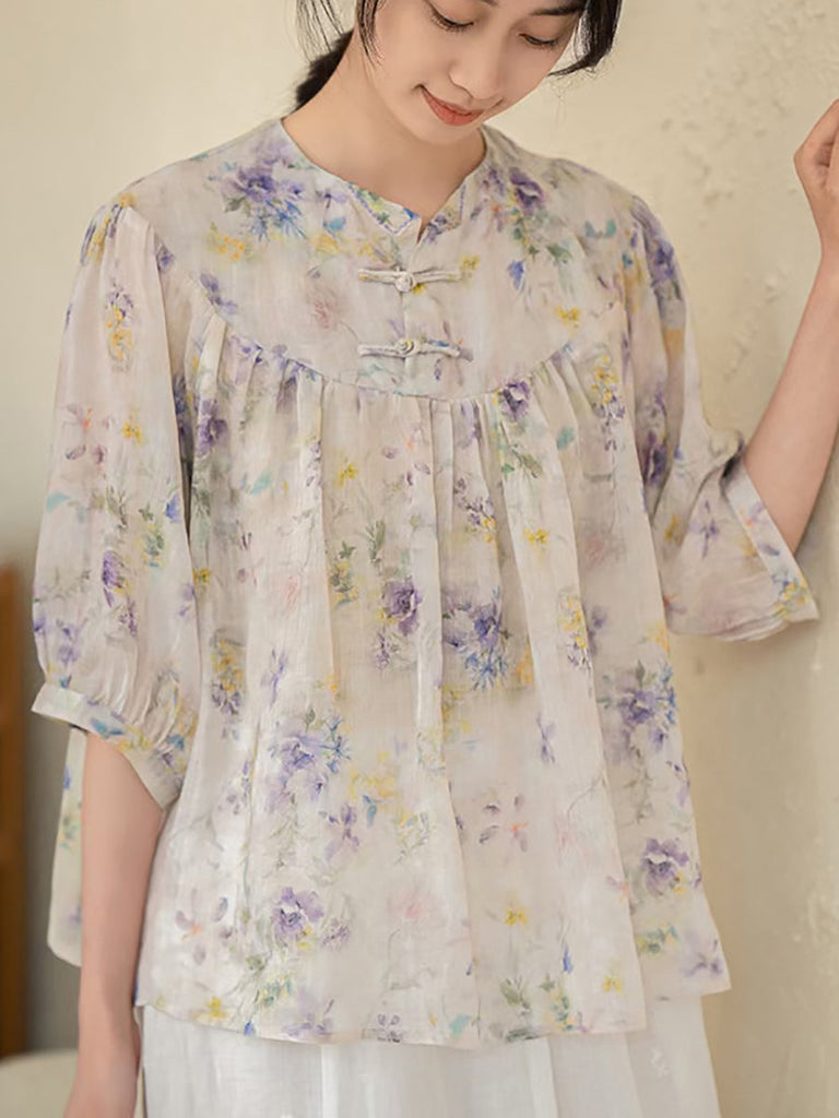 Women Summer Artsy Floral Ramie Loose Shirt XX1033