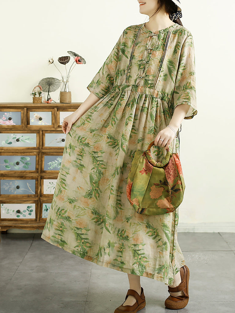 Crafted from luxurious ramie fabric and boasting a stand collar, this fashionable dress showcases an exquisite floral design and three-quarter length sleeves. Ideal for the sun-kissed days of summer, it drapes elegantly to the mid-calf, infusing any wardrobe with a touch of artistic flair.