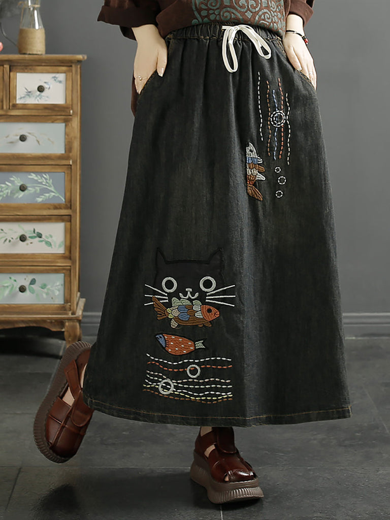 Women Summer Casual Cat Fish Embroidery Denim Skirt KL1008