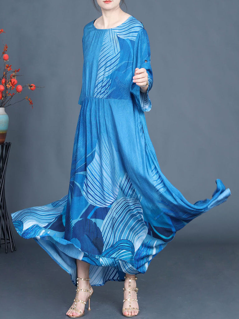 Women Summer Casual Print Blue O-Neck Maxi Dress AS1040
