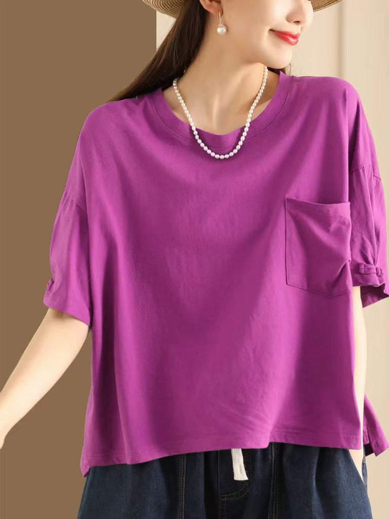 This stunning shirt is crafted from luxurious cotton and showcases a striking solid pattern. Adorned with an elegant O-neck collar and chic short raglan sleeves, this casual style is an ideal choice for the warm and stylish spring and summer months.