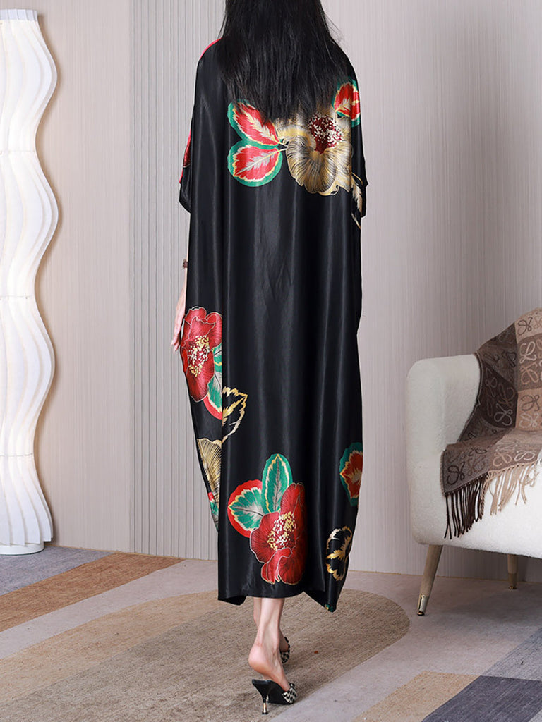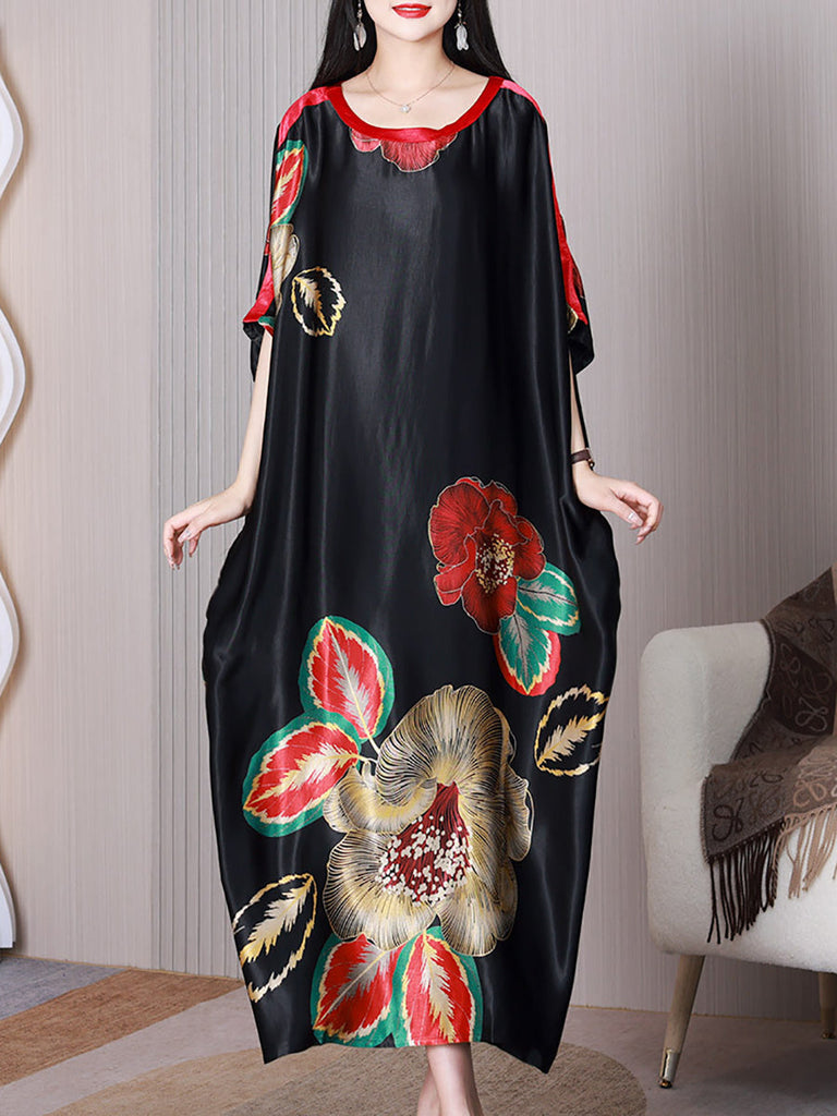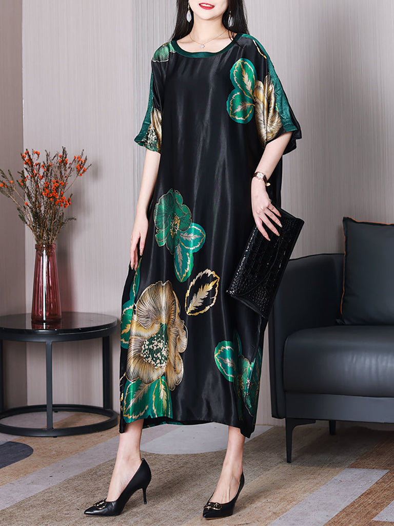 Indulge in the splendor of our Women's Summer Elegant Flower Silk Loose Dress XX1003, adorned with a delicate floral and rhomboid design on a round neckline. The airy batwing sleeves and graceful calf-length create a stylish and comfortable ensemble, perfect for the warm summer months.