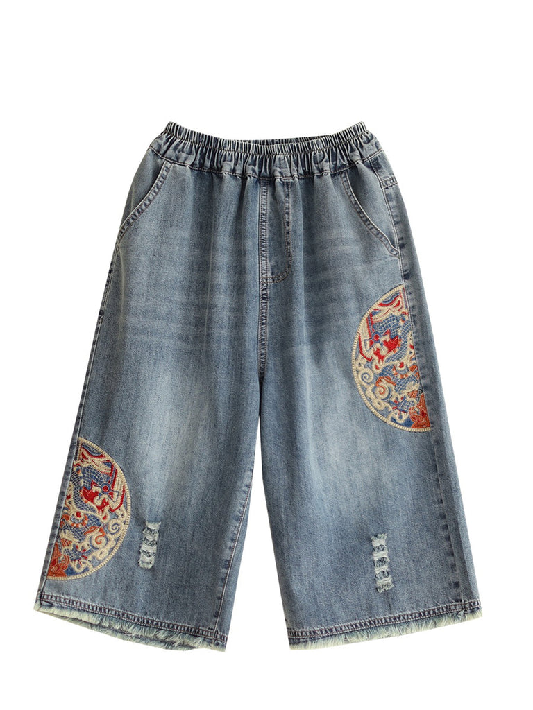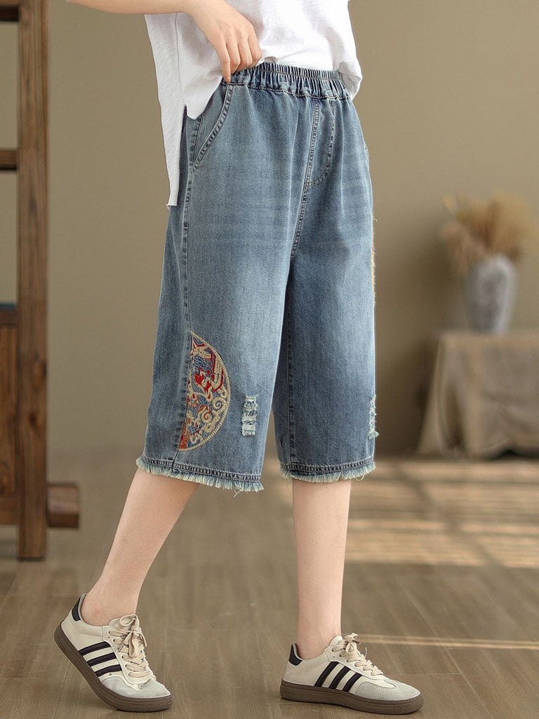 Women Summer Embroidery Knee-Length Denim Pants IO1023