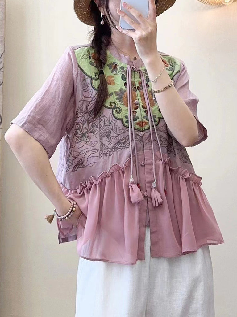 Women Summer Ethnic Embroidery Jacquard Shirt QW1012