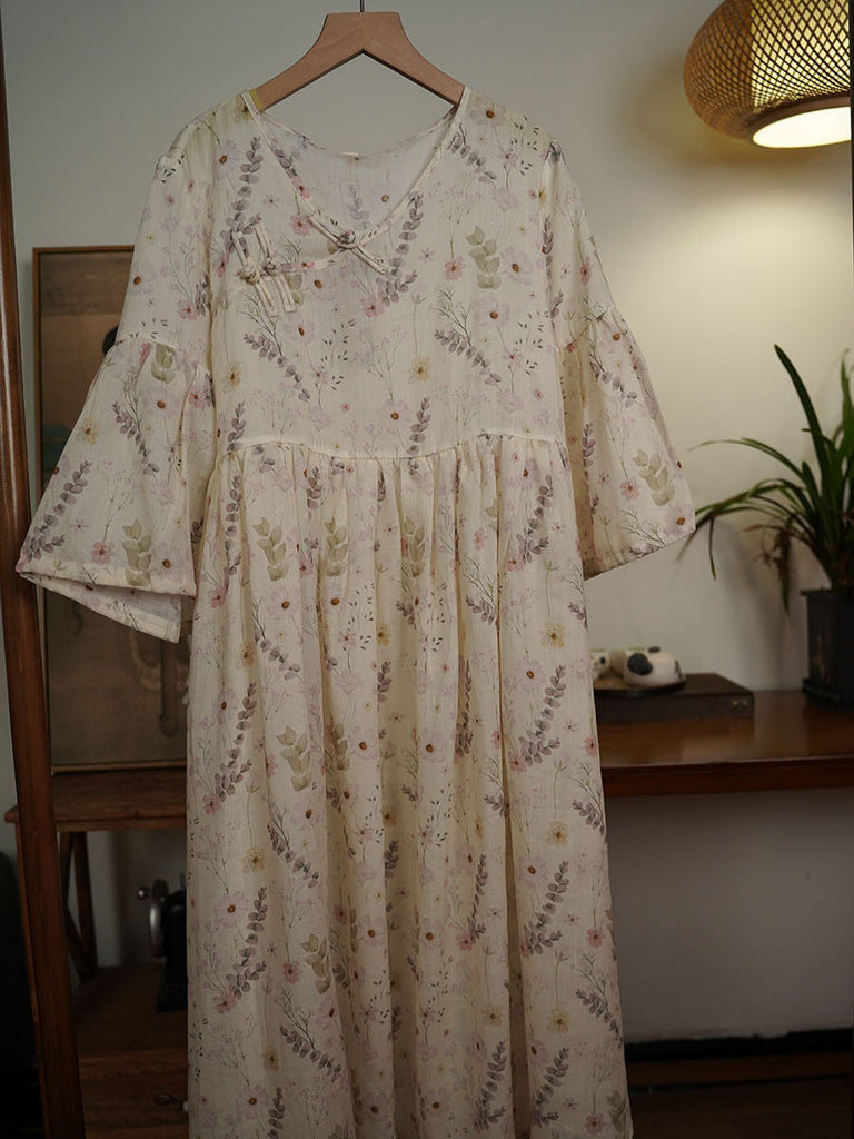 Women Summer Ethnic Floral V-Neck Buckle Ramie Dress TY1007