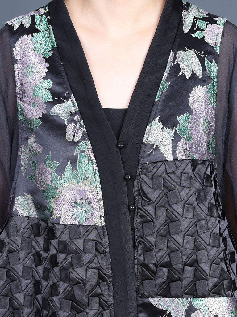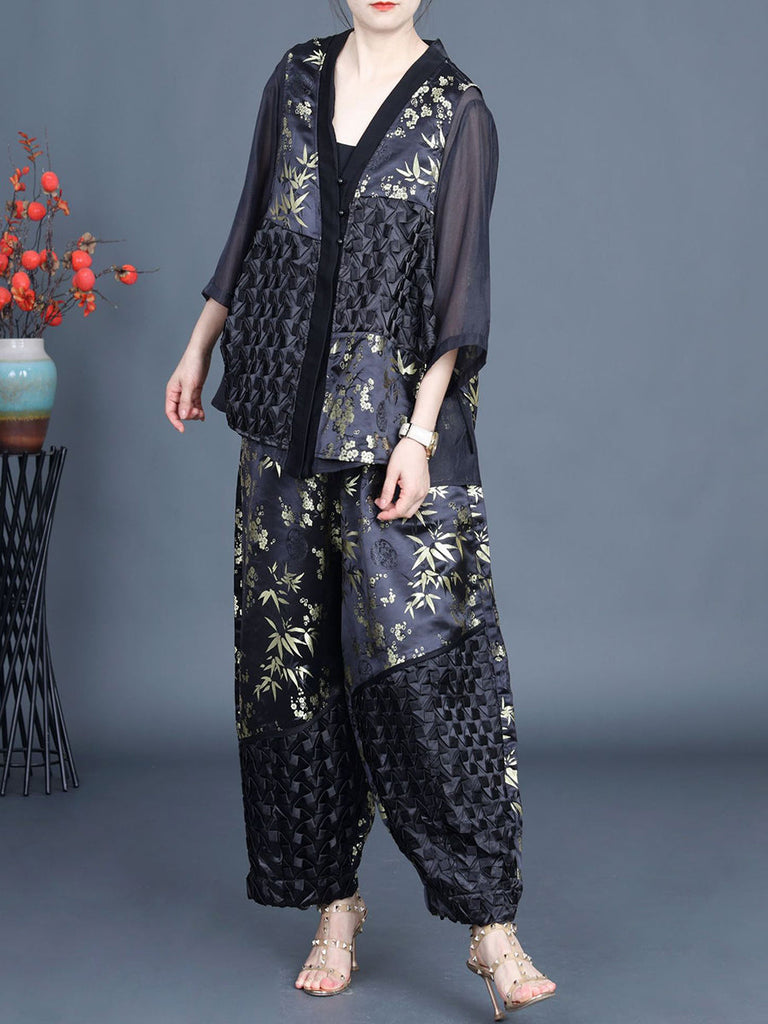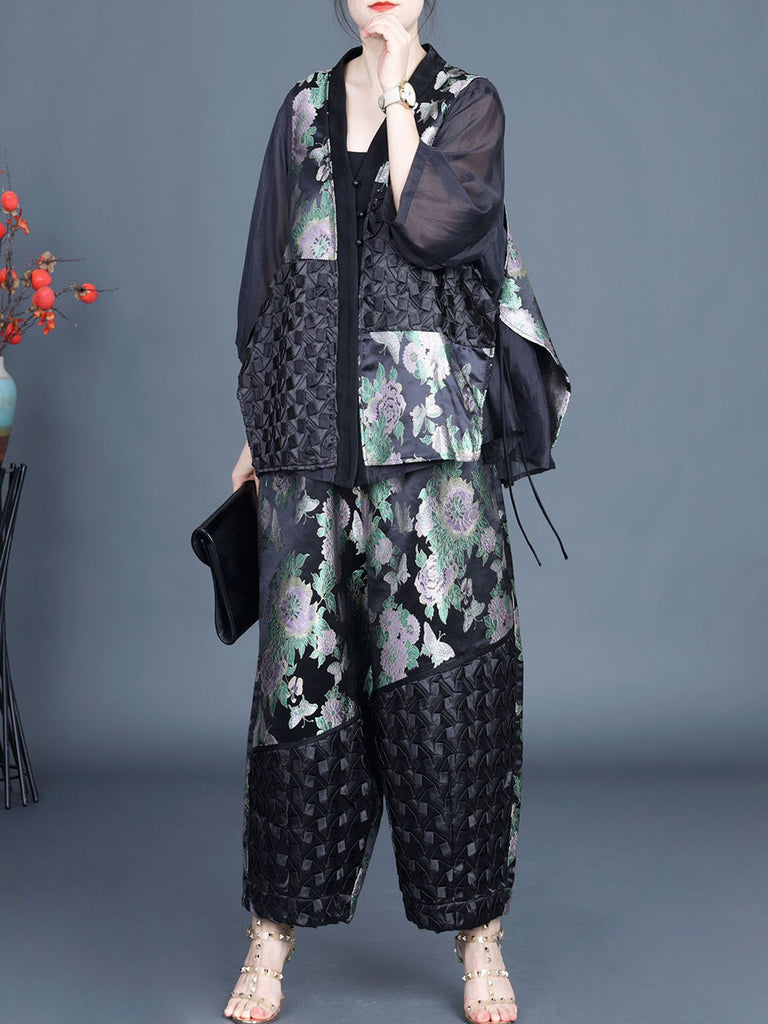 Discover the elegant and exclusive appeal of our Women Summer Ethnic Flower Spliced Shirt+Pants KL1015, made with a luxurious blend of 70% Song Brocade and 30% Tencel. Immerse yourself in its retro charm with a V-neck collar and button-up placket, adorned with a beautiful floral design. The three quarter sleeves and ankle-length pants are complete with button details and an elastic waist for unrivaled comfort. Elevate your summer wardrobe with this sophisticated and stylish outfit.