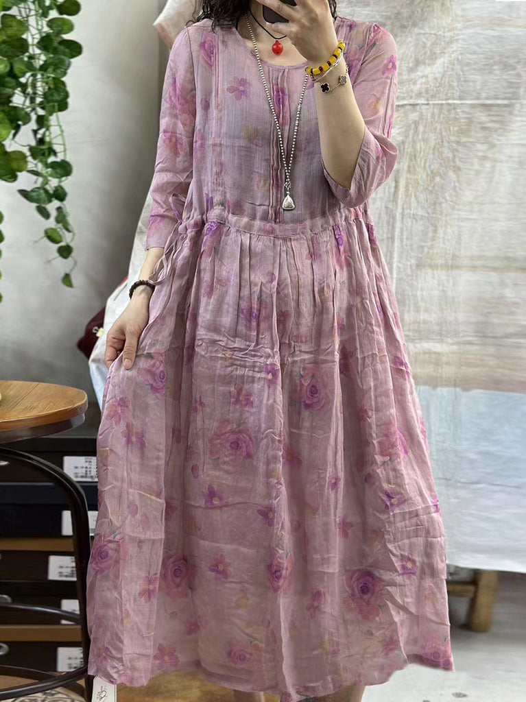 Women Summer Floral Artsy Strap Ramie Dress AA1001