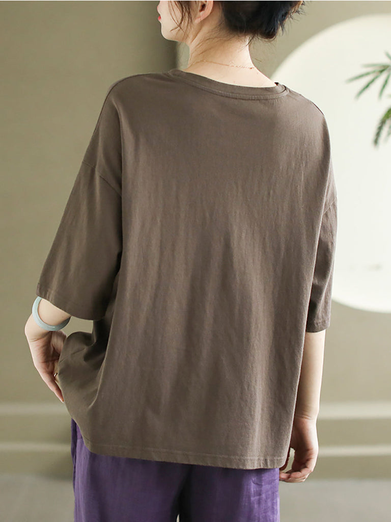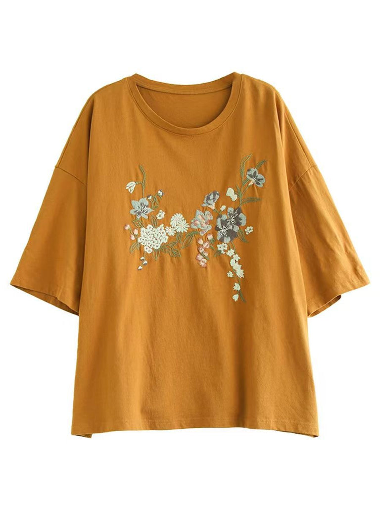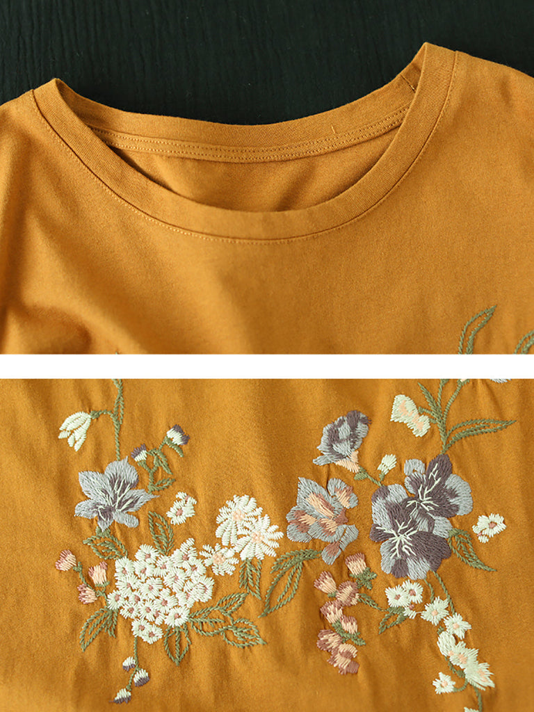 Women Summer Flower Embroidery Cotton O-Neck Shirt AS1007