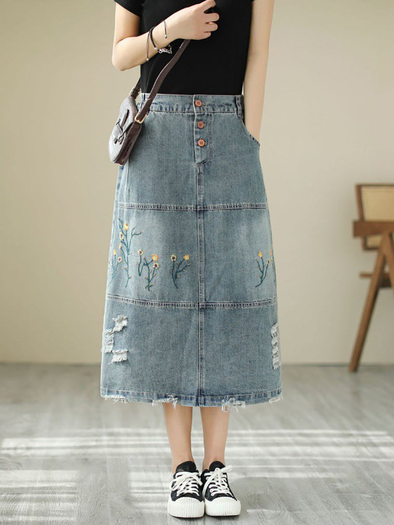 Women Summer Flower Embroidery Frayed Denim Skirt AS1041