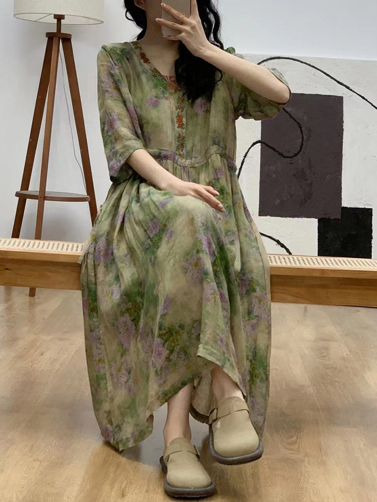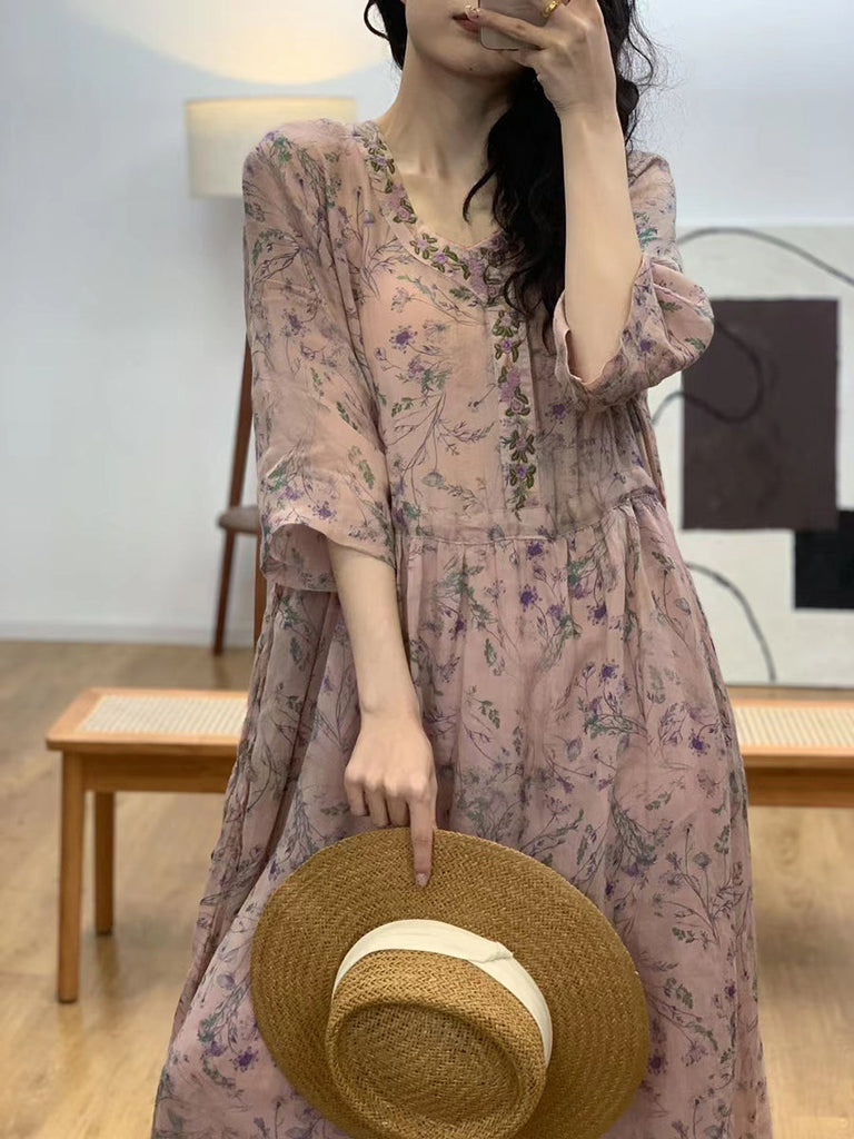 Women Summer Flower Embroidery Ramie V-Neck Dress UI1001