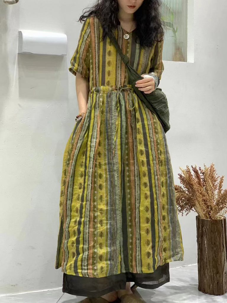 Women Summer Flower Spliced Ramie Strap Waist Dress TY1046