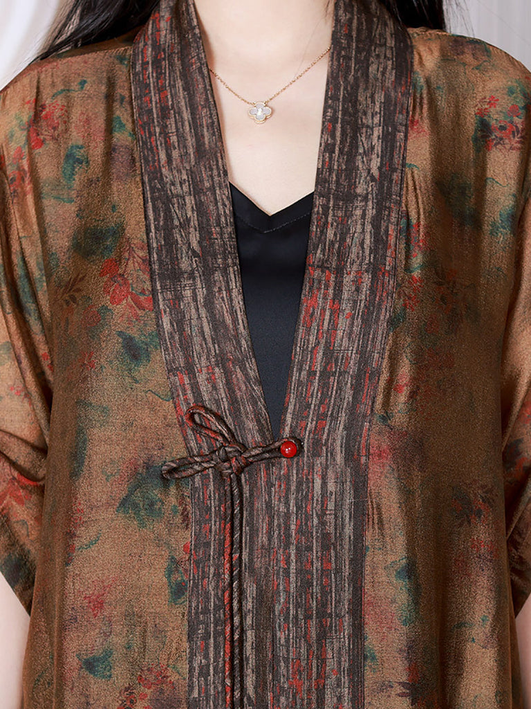 Women Summer Retro Floral Spliced Silk Long Shirt Coat QW1009