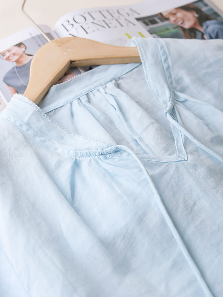 Women Summer Solid Ruffle-Sleeve Ramie Thin Shirt WE1026