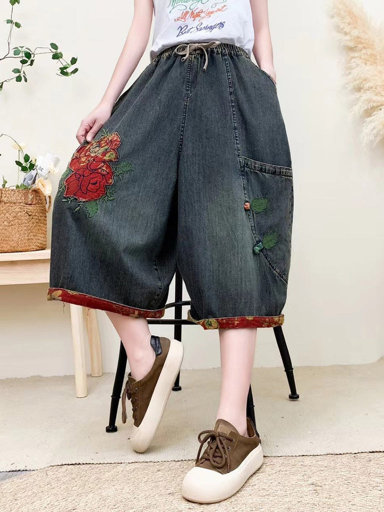 Women Summer Vintage Flower Embroidery Denim Pants QW1024