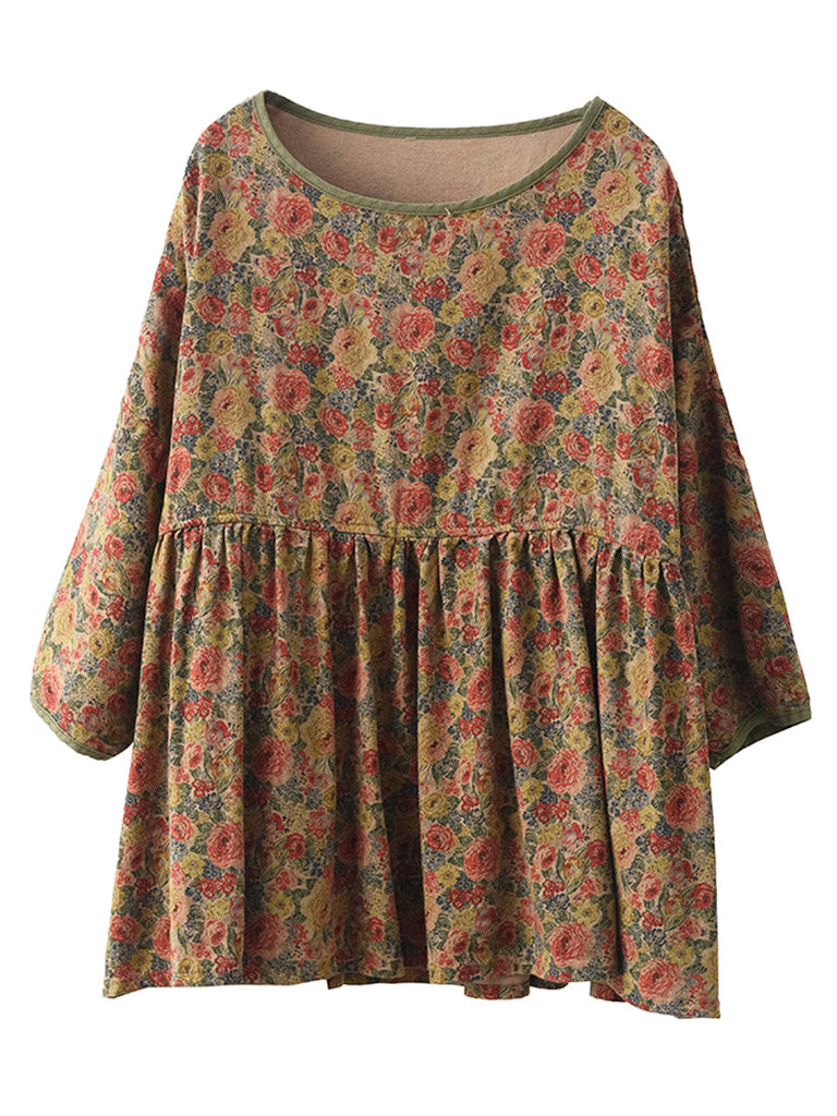Elevate your style with our Women Summer Vintage Flower Spliced Loose Shirt. Its solid pattern, O-Neck collar, and half raglan sleeves exude elegance, making it the ultimate choice for Spring and Summer.